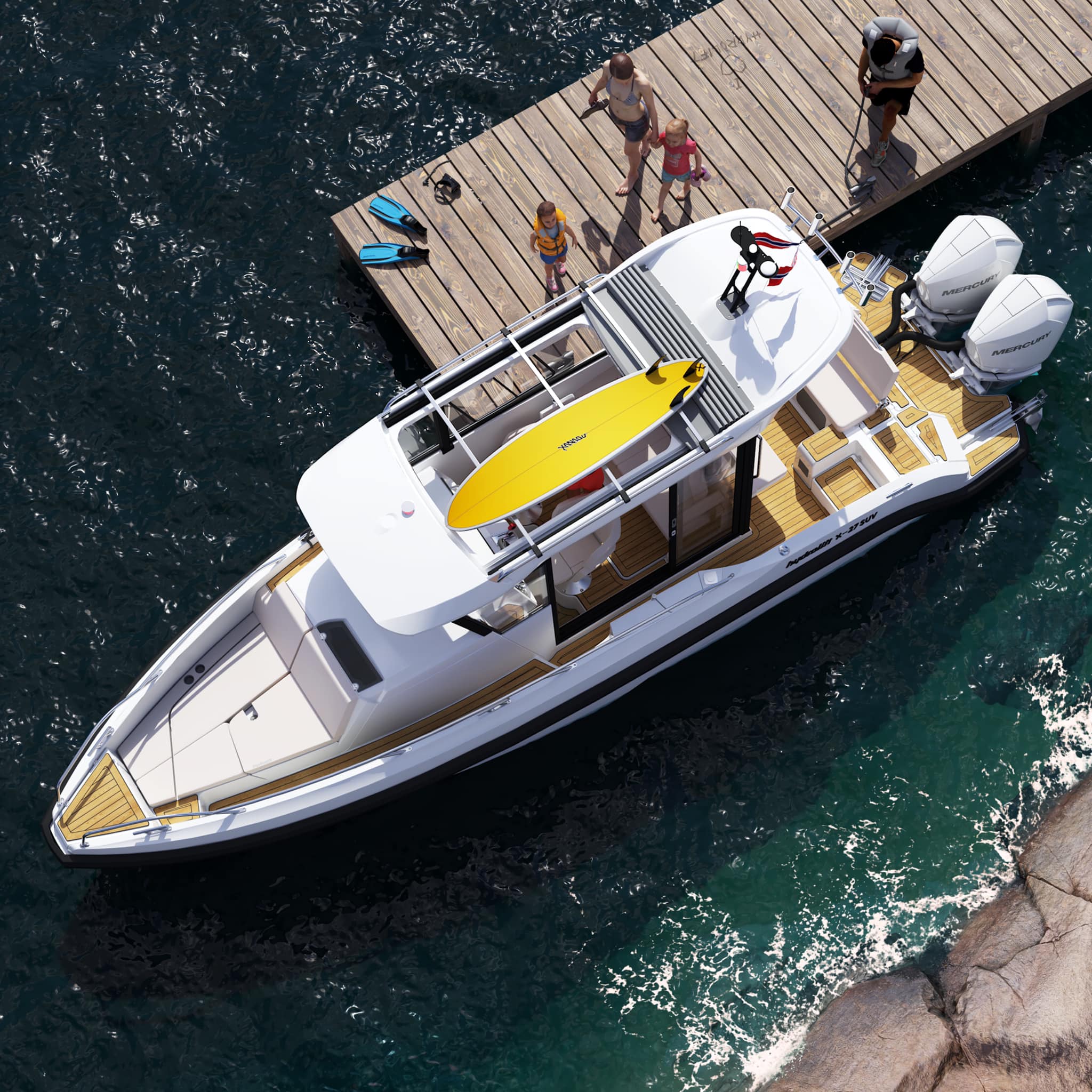Vill man så kan man låta förse den med ända upp till 2 x 300 hk på akterspegeln, som ska räcka till en toppfart på 72 knop.