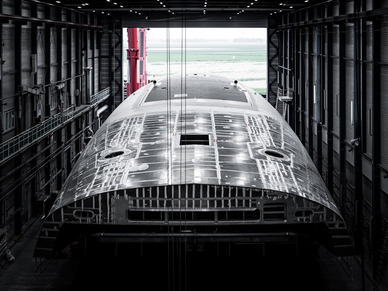 Det man hade att hantera under skrovvändningen var dock ”bara” 61 meter. Nu återstår alltså att rulla in skrovet i bygghallen igen och att komplettera det med det 24 meter långa förskeppet. förskeppet.