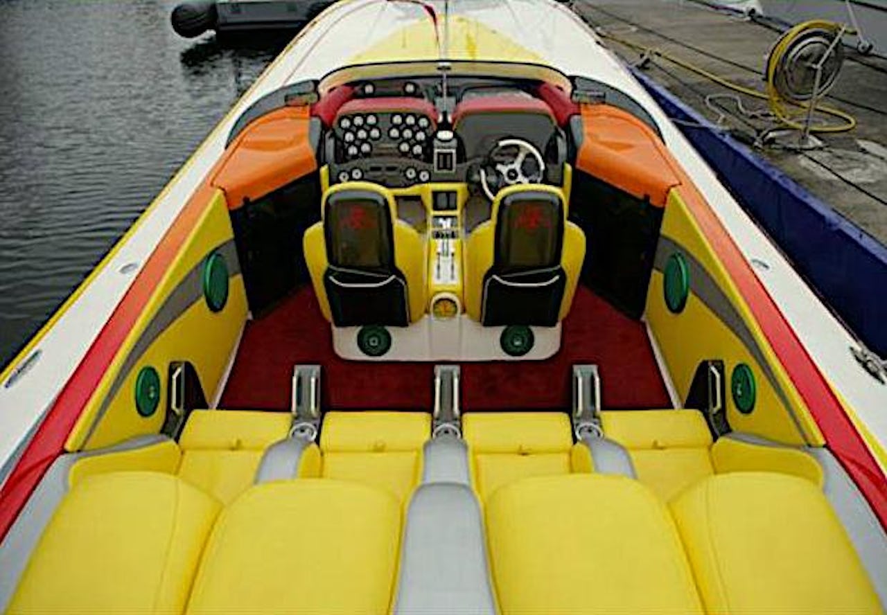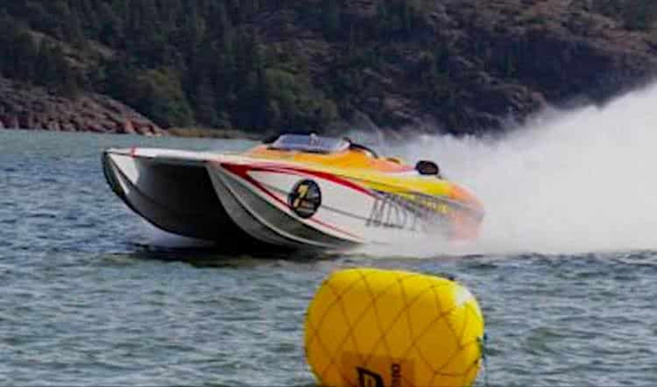 Denna katamaran har dubbla turbinmotorer [2 x 1 850 hk) som tagits från en helikopter och konverterats till marint bruk.