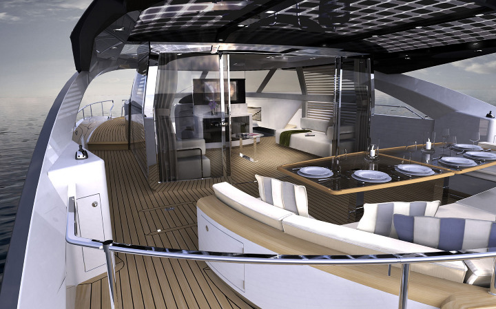 I låga farter ska eCat kunna gå på sin elektriska motor som delvis försörjs av 23 kvm genomskinliga solcellspaneler som sitter på det glasade taket. Båten använder också bränsleceller som energikälla (läs vår test av bränslecellen Efoy för fritidsbåtar). När det ska gå undan står två Volvo Penta-dieslar med IPS-drev för kraften.