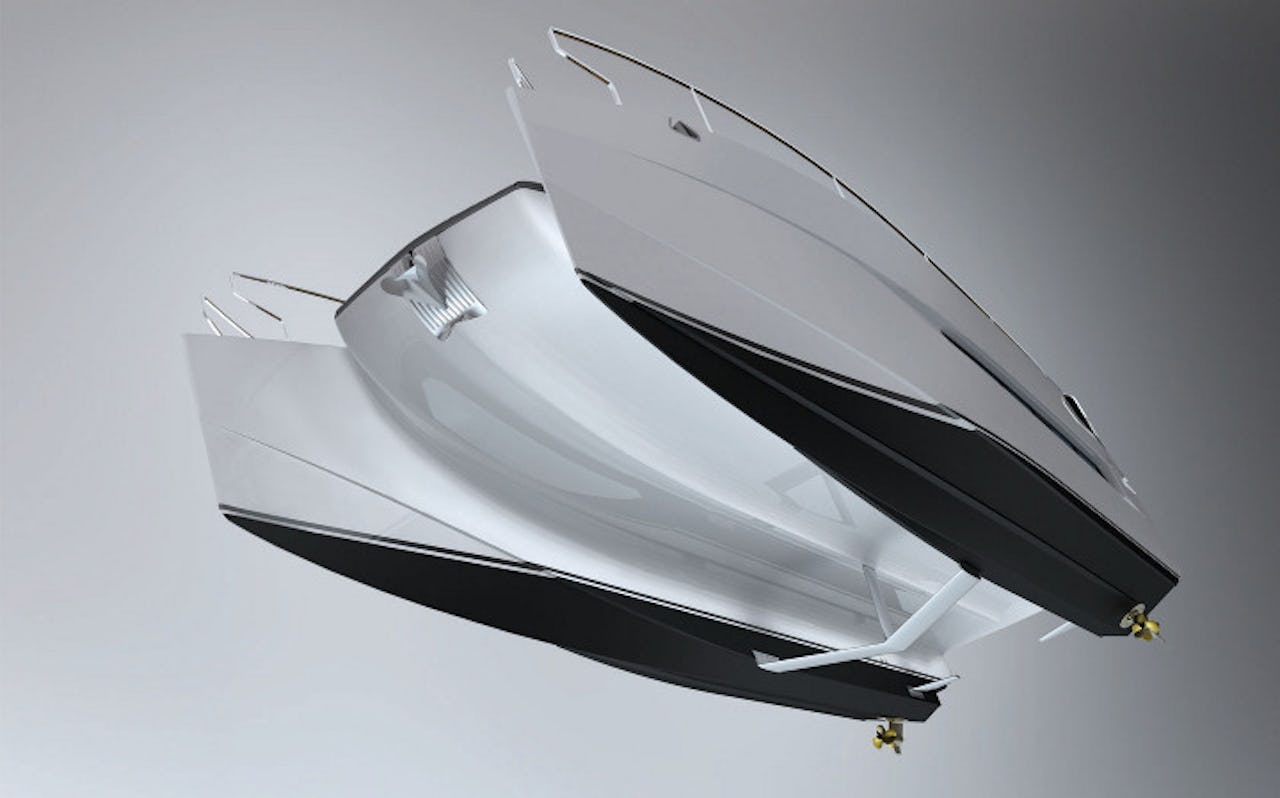 Mellan skroven sitter ett stort bärplan från sydafrikanska Hysucat, vars produkter finns på alltifrån små rib-båtar till större komersiella färjor. Det ger mindre motstånd med alla fördelar det innebär. På just den här modellen har det kalkylerats fram att bärplanet ger 40 procent högre fart.
