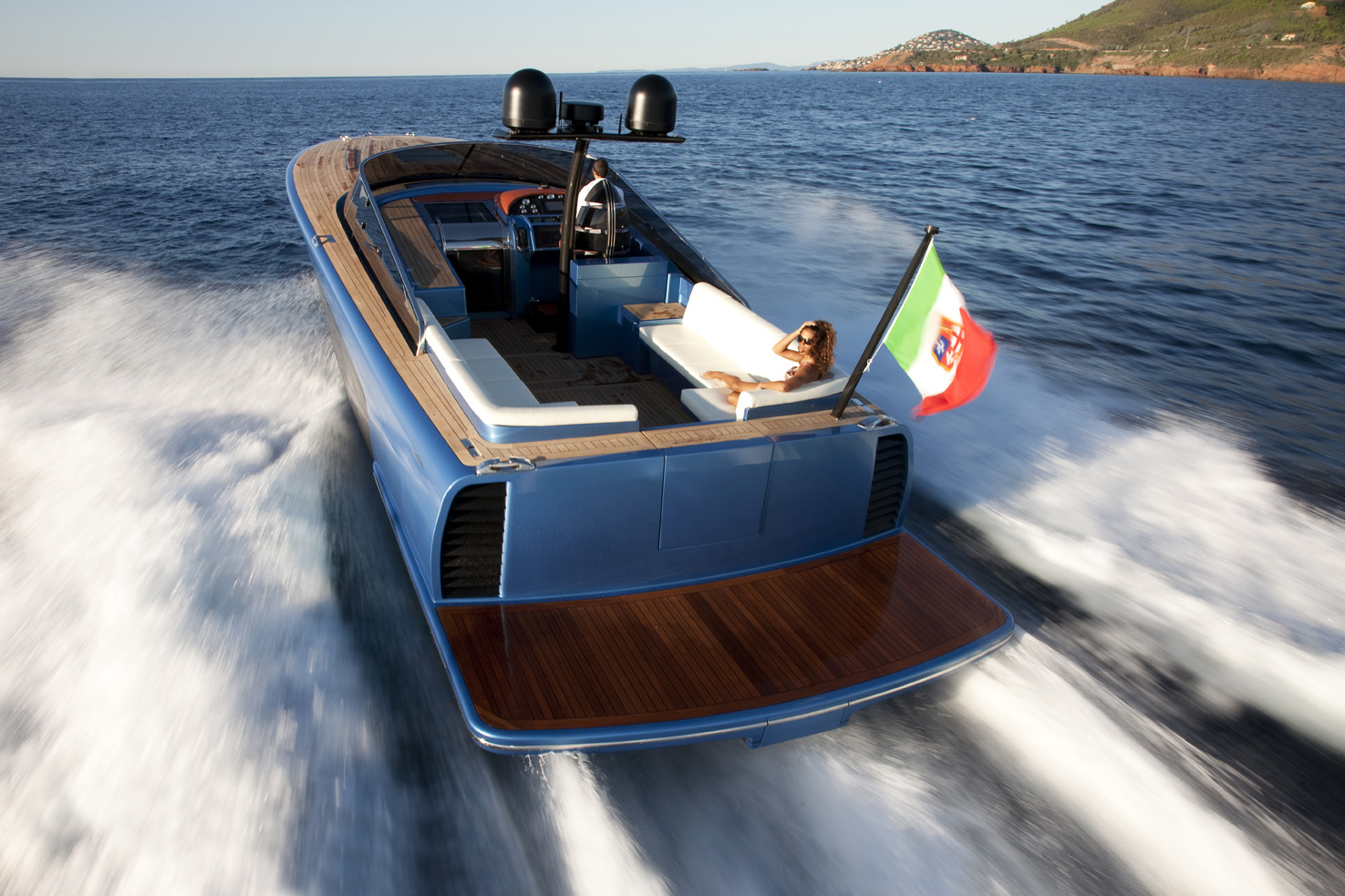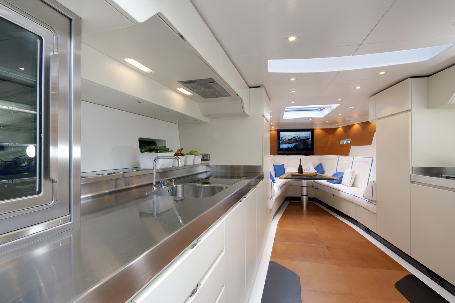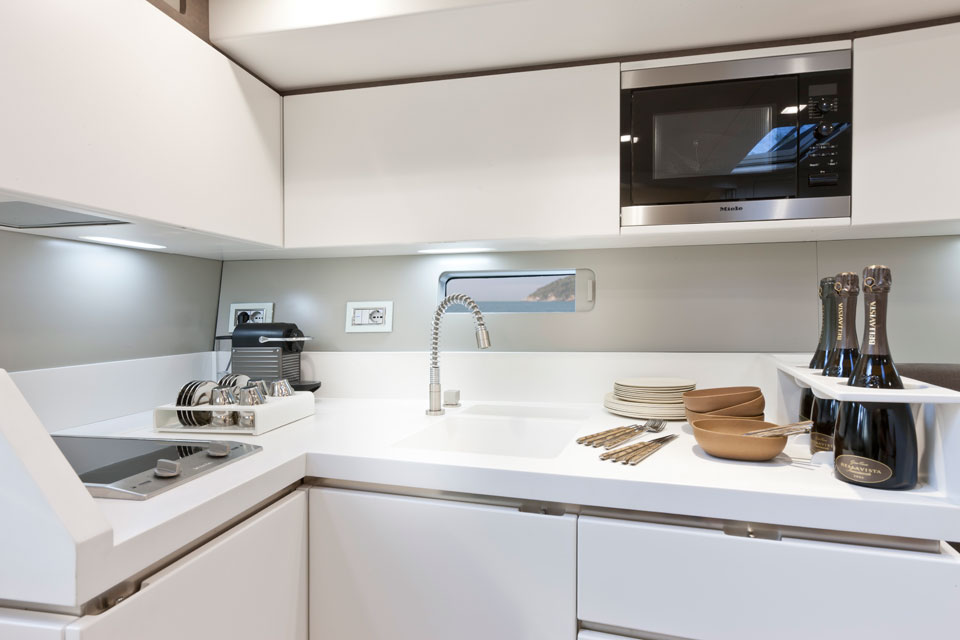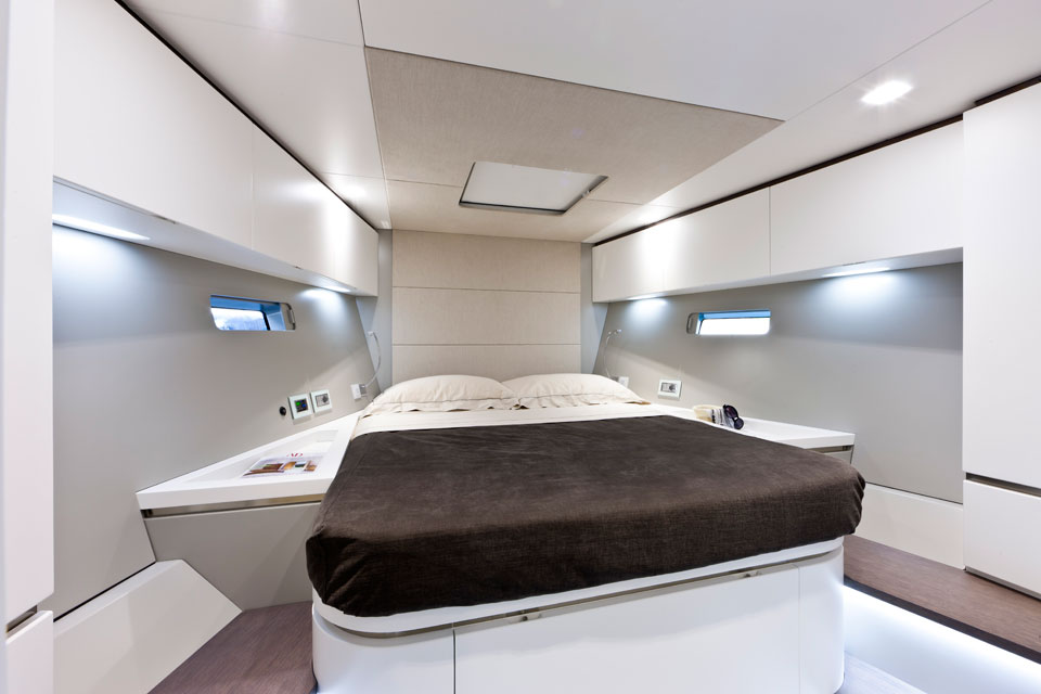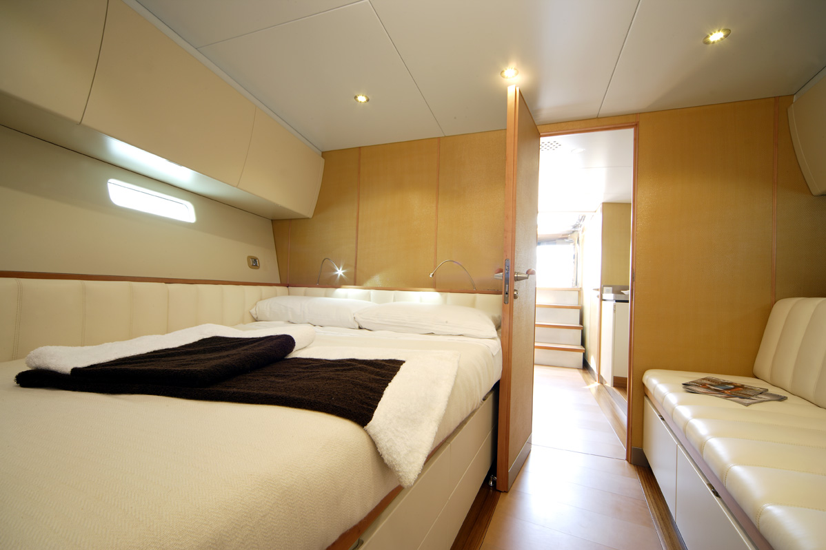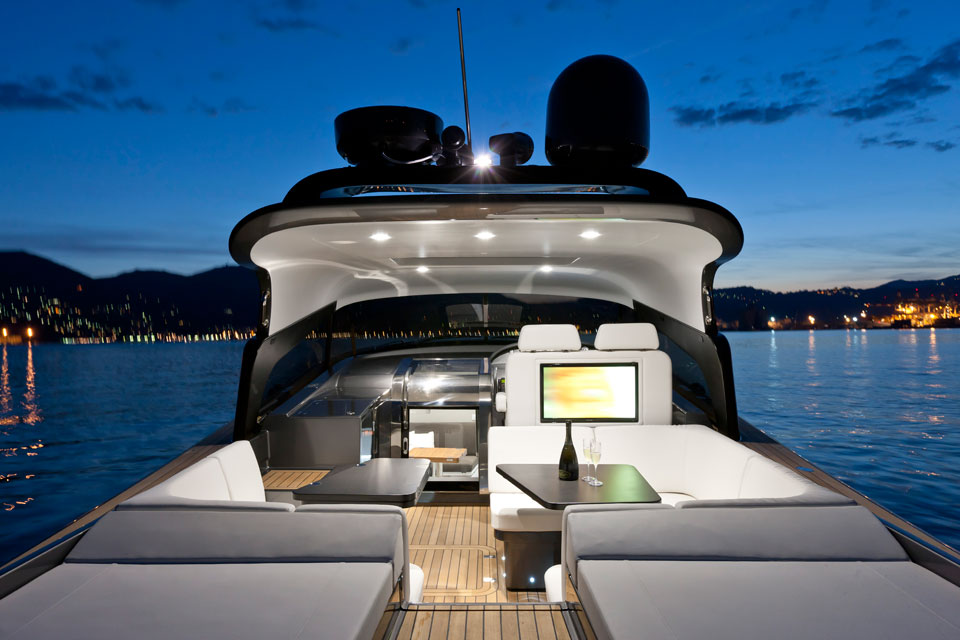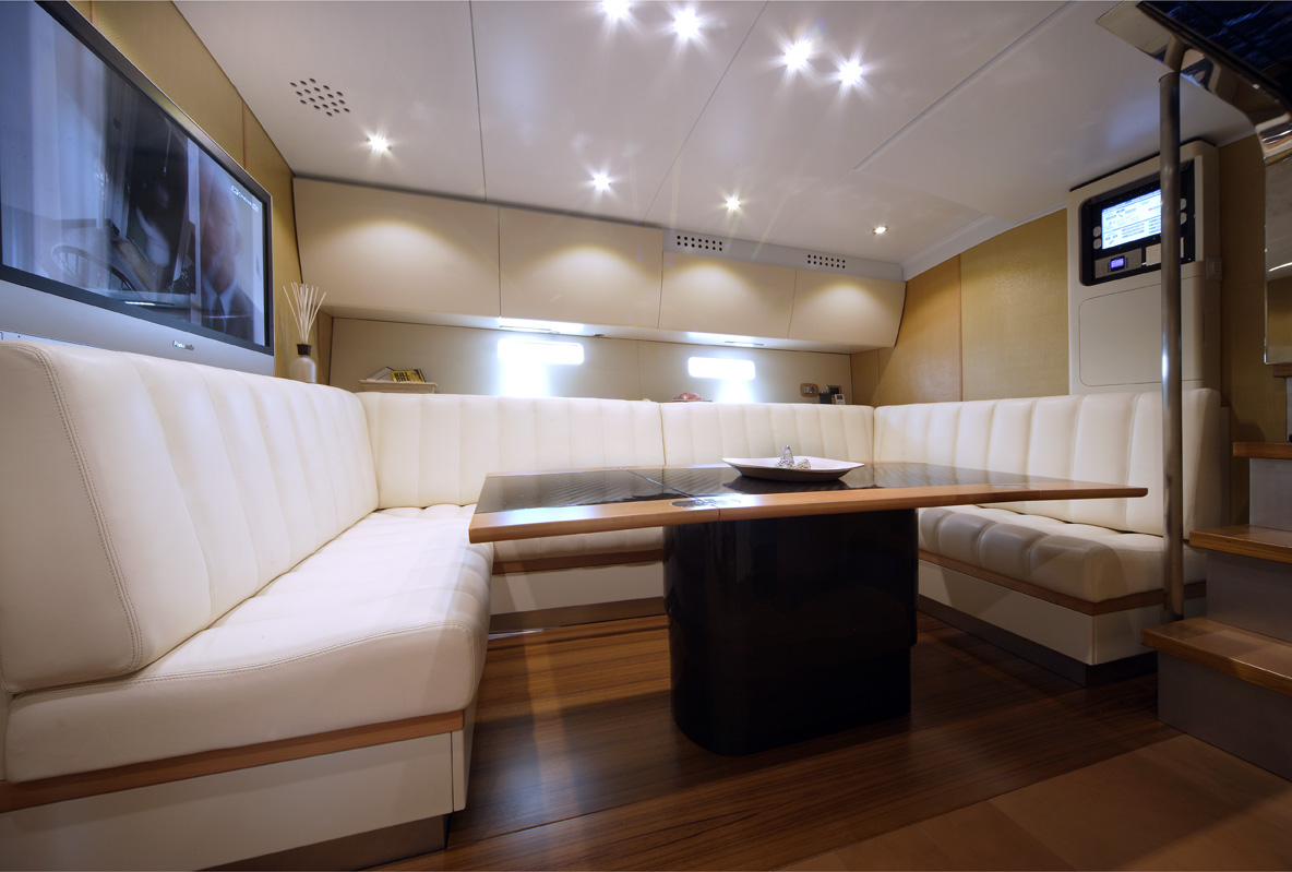 En genomgående stil, såväl utvändigt som invändigt, är stora öppna ytor. Förarplats, wetbar, en rejäl soffgrupp och två jättelika solsängar utvändigt. Luftig salong, en ägarhytt och två toalettutrymmen (varav det ena längst fram i fören) invändigt.