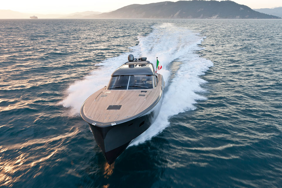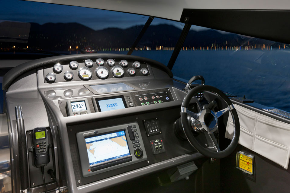 Därför har den ingredienser som rak stäv, långa svepande linjer och såväl skrov som däck och överbyggnad i moderna kompositmaterial. På så sätt har man lyckats hålla vikten nere till smått imponerande 10,5 tom inklusive två feta inombordsdieslar.
