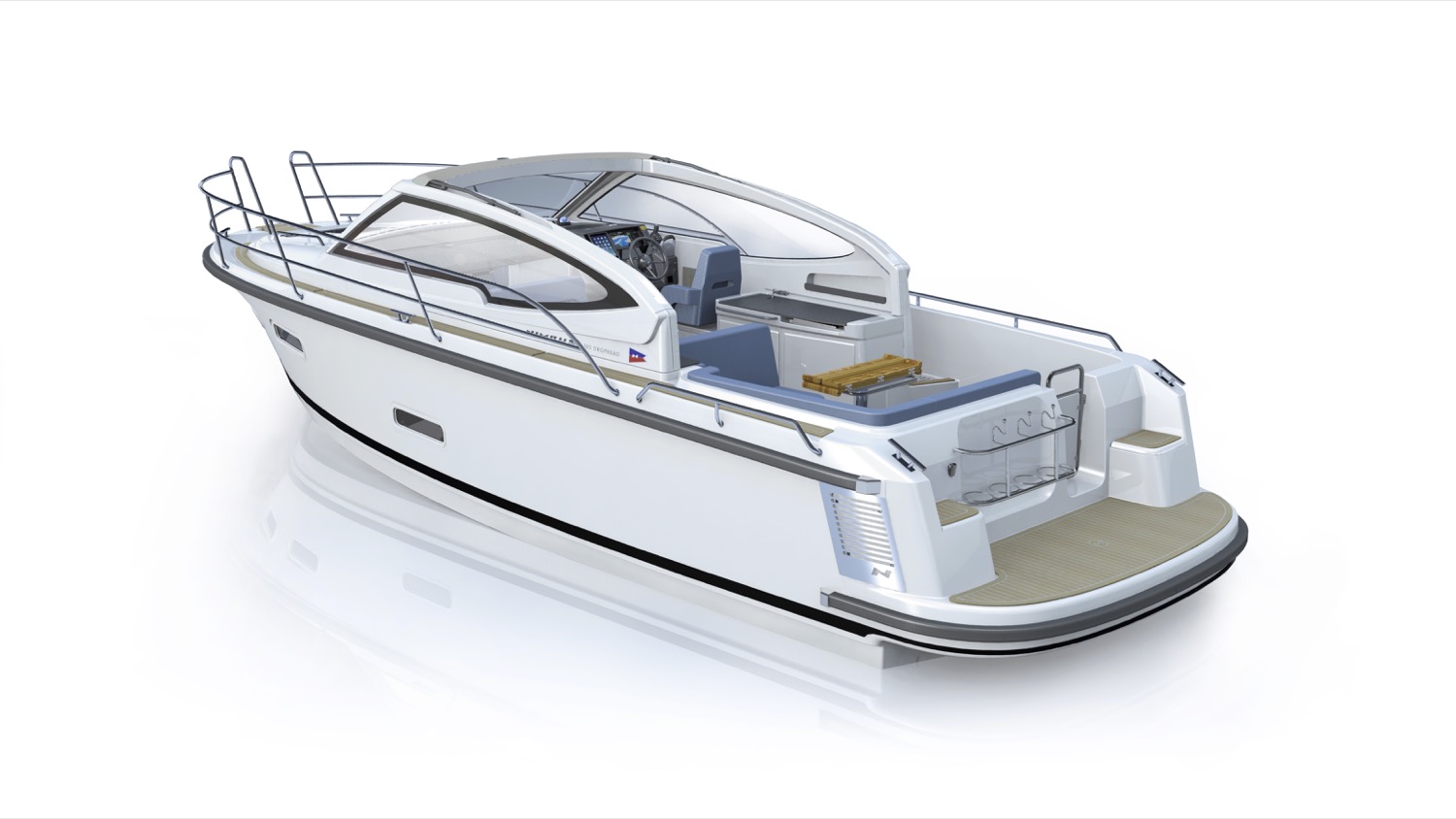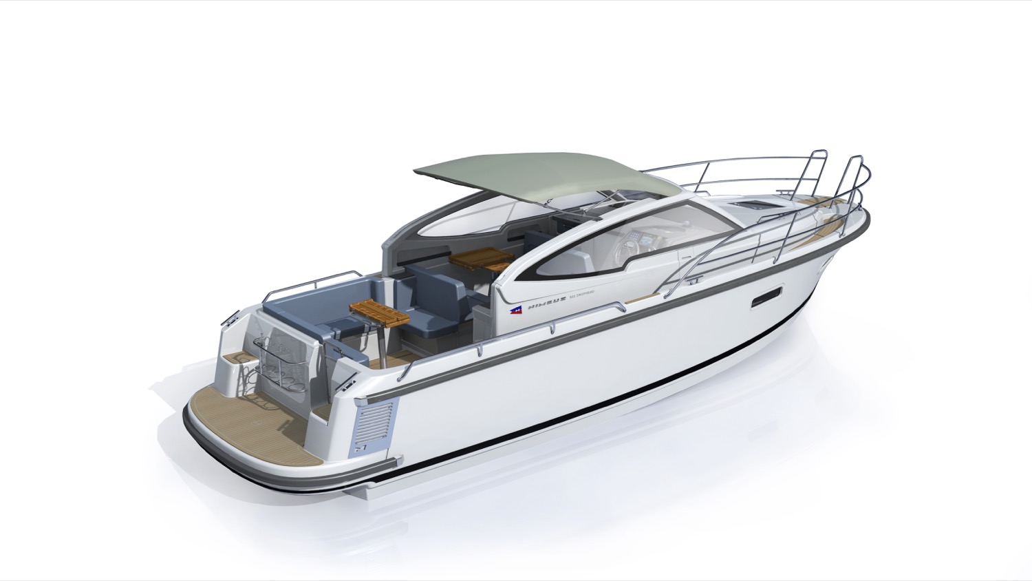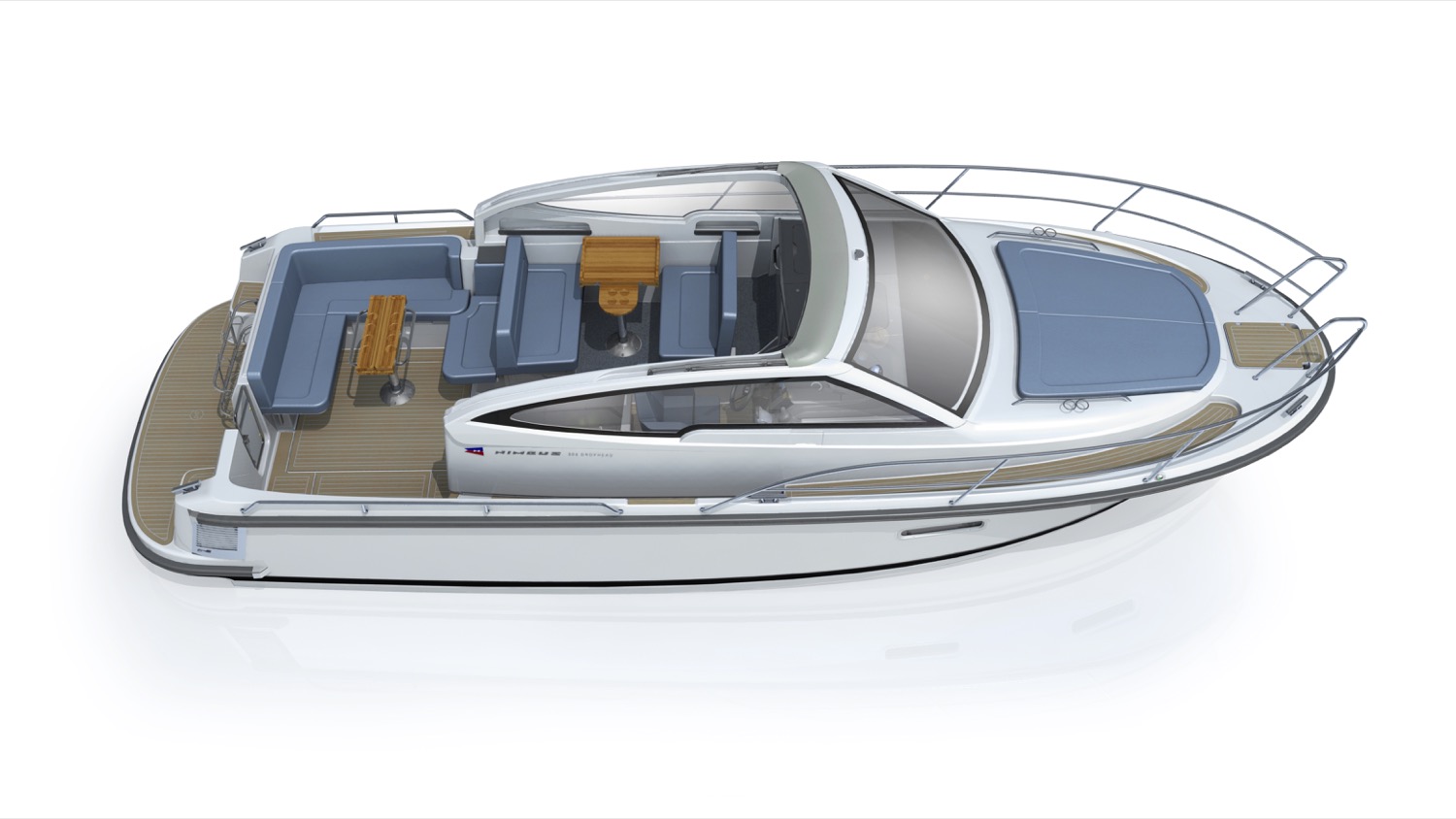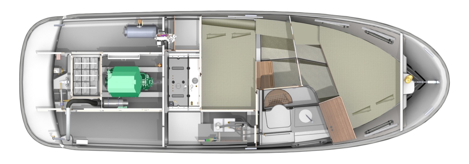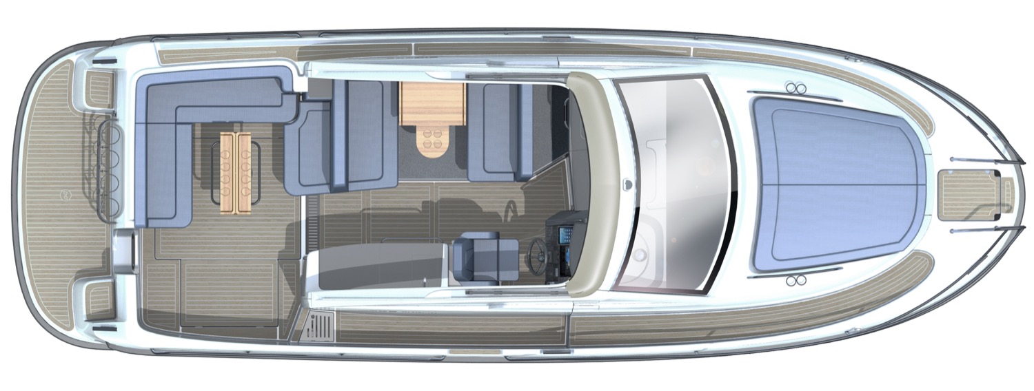 Ett exempel är det elektriska kapelltaket som med en knapptryckning fälls ner i en integrerad kassett i rutramen – snyggt och enkelt. I uppfällt läge skyddar kapelltaket hela cockpit, det vill säga förarplats, wetbar och matplats. Matplatsen för fyra kan enkelt konverteras till en extra dubbelbädd. Den främre soffan på babord sida är vändbar så att två personer kan åka med i färdriktningen.