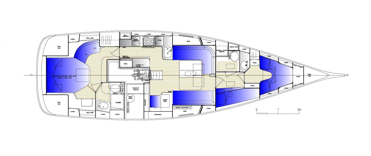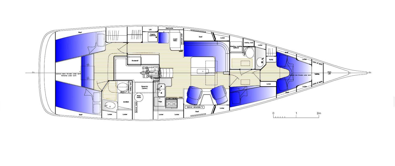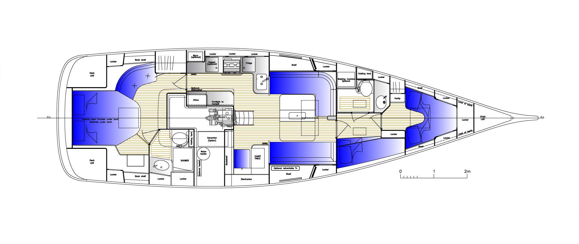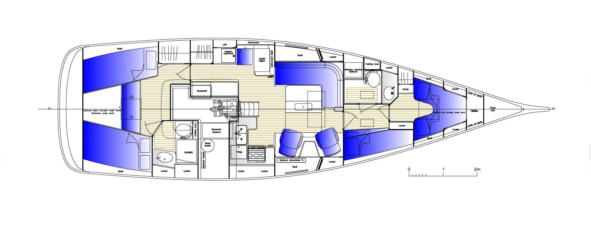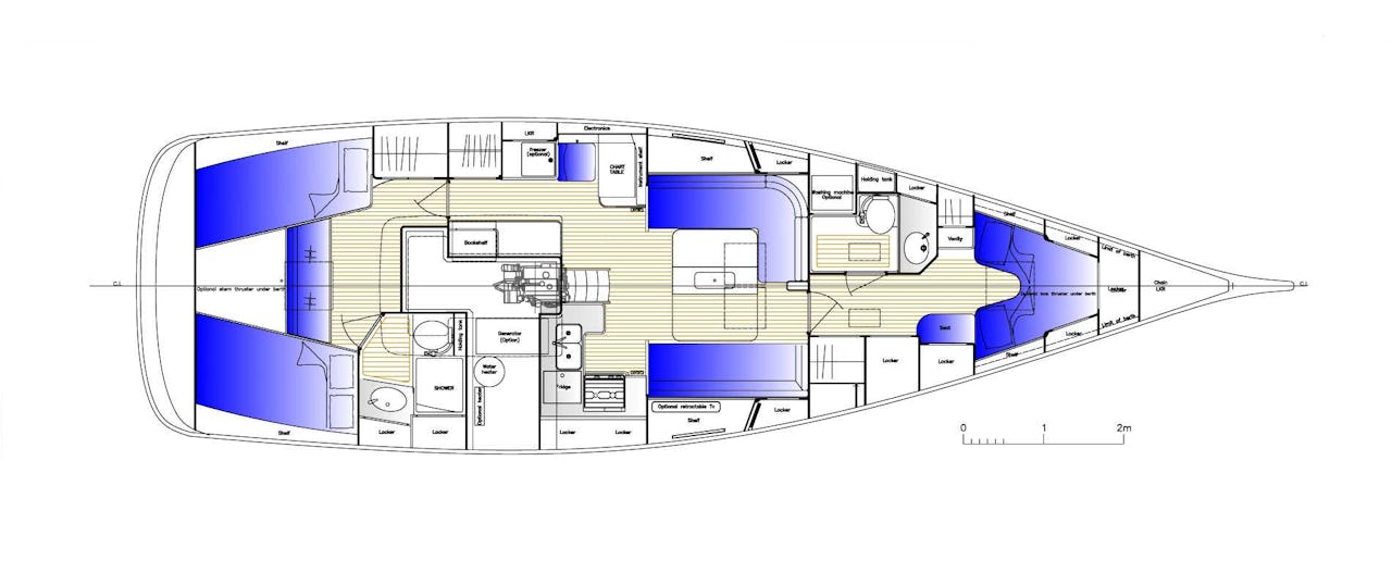 I salongen finns det flera valmöjligheter när det gäller L-soffa alternativt fåtöljer. Sedan finns det flera möjligheter när det gäller disponering av sovutrymmen (antal kabiner).