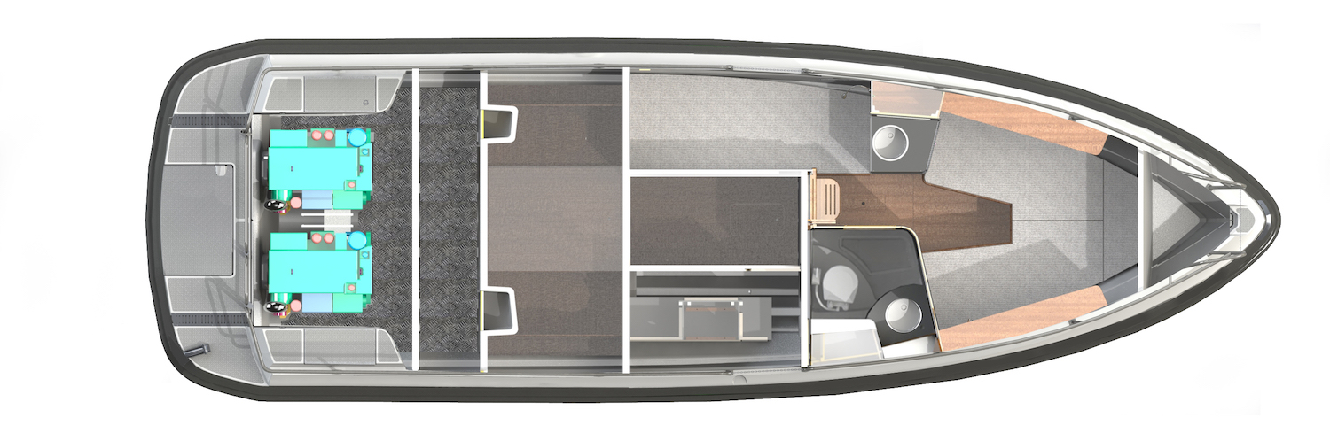 Det vanligaste (och kanske mest förnuftiga?) valet av motor blir dock en enkel Volvo Penta D6 på 400 hk som räcker till en toppfart på ungefär 35 knop.