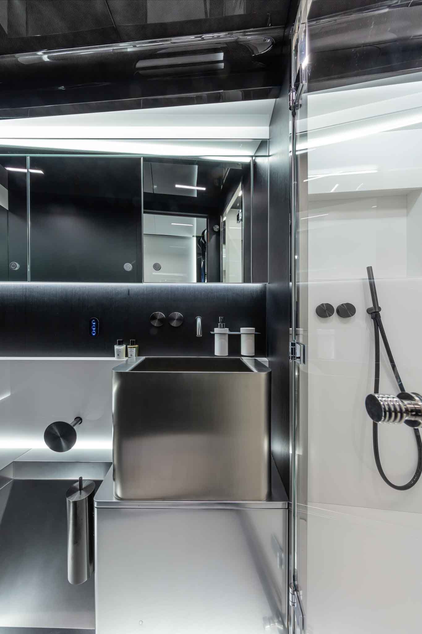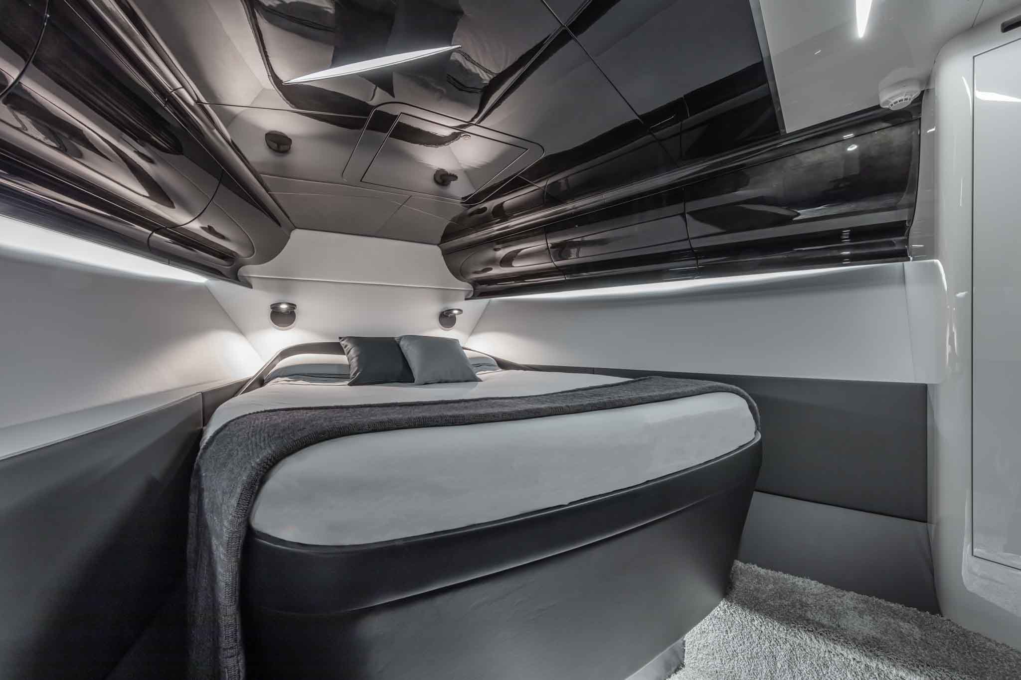 Mannen bakom konceptet – Francesco Guida – förklarar att inredningen inspirerats av inredningen i privata jetplan och har givitsett monokromatiskt svartvitt färgschema. Sovrummen har läderklädda sängar och sidoskåp som efterliknar det sovutrymmen du finner på förstaklass-flygresor. Detaljerna i badrummet är täckta med rostfritt stål inklusive toaletten.