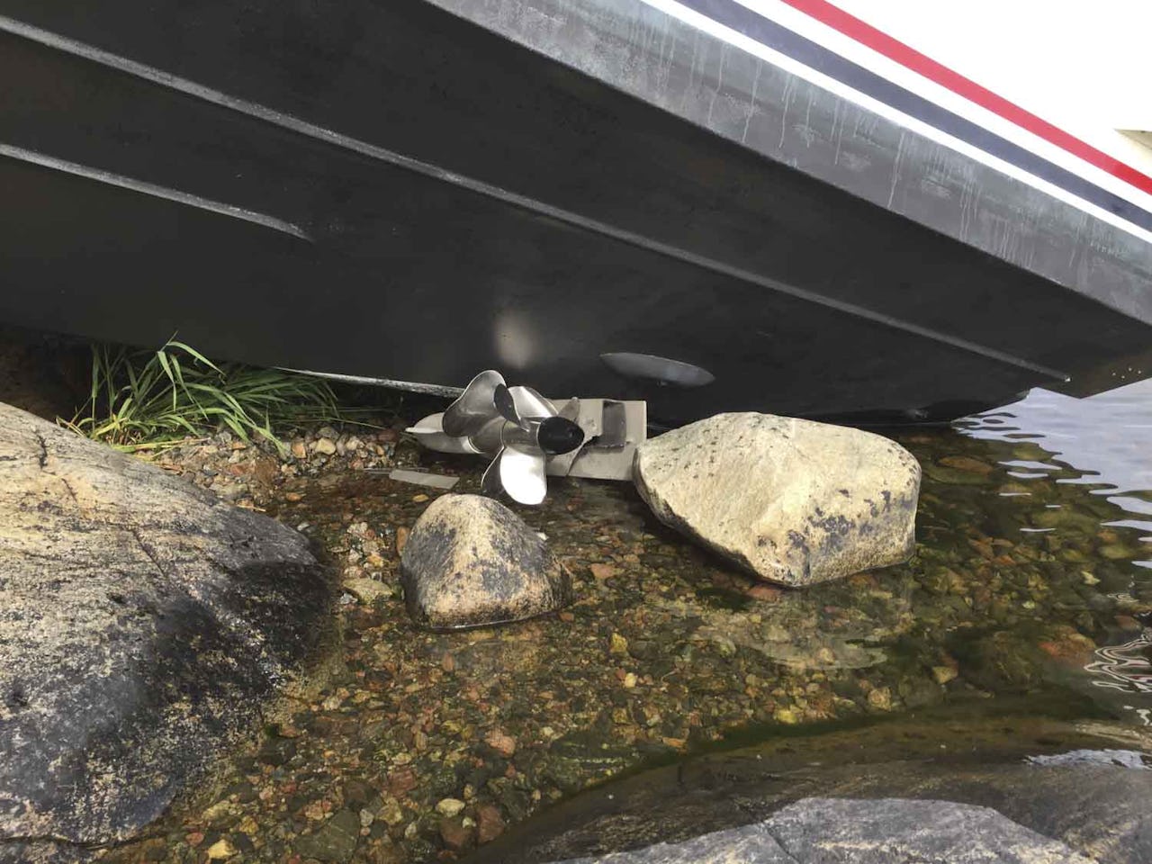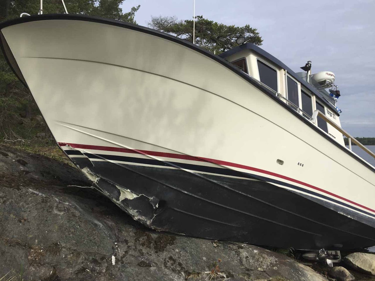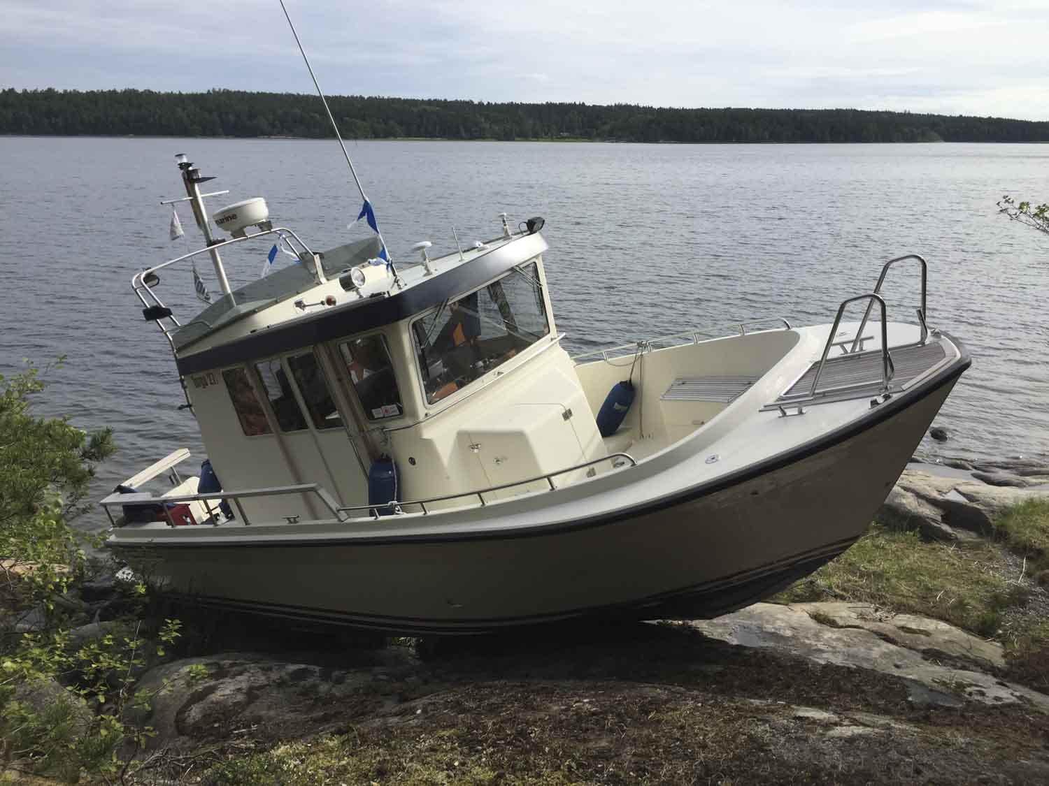Polis och räddningstjänst kallades till Bosön igår efter att en Targa 27 kört upp på klipporna vid Södergarnsvägen, nedanför ett sommarstugeområde.