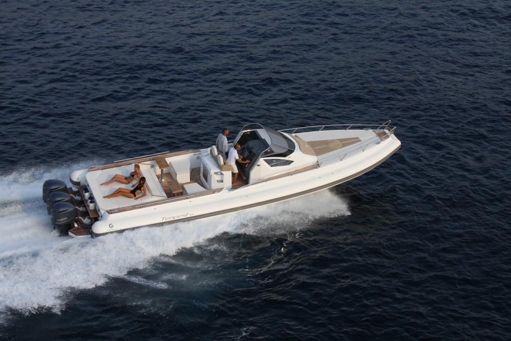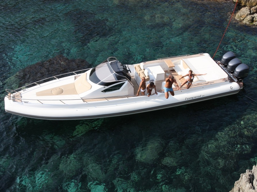 Mässans största RIB lär vara Capellis TE44 med trippla 300 hk, ruff och väl tilltagen solbädd.