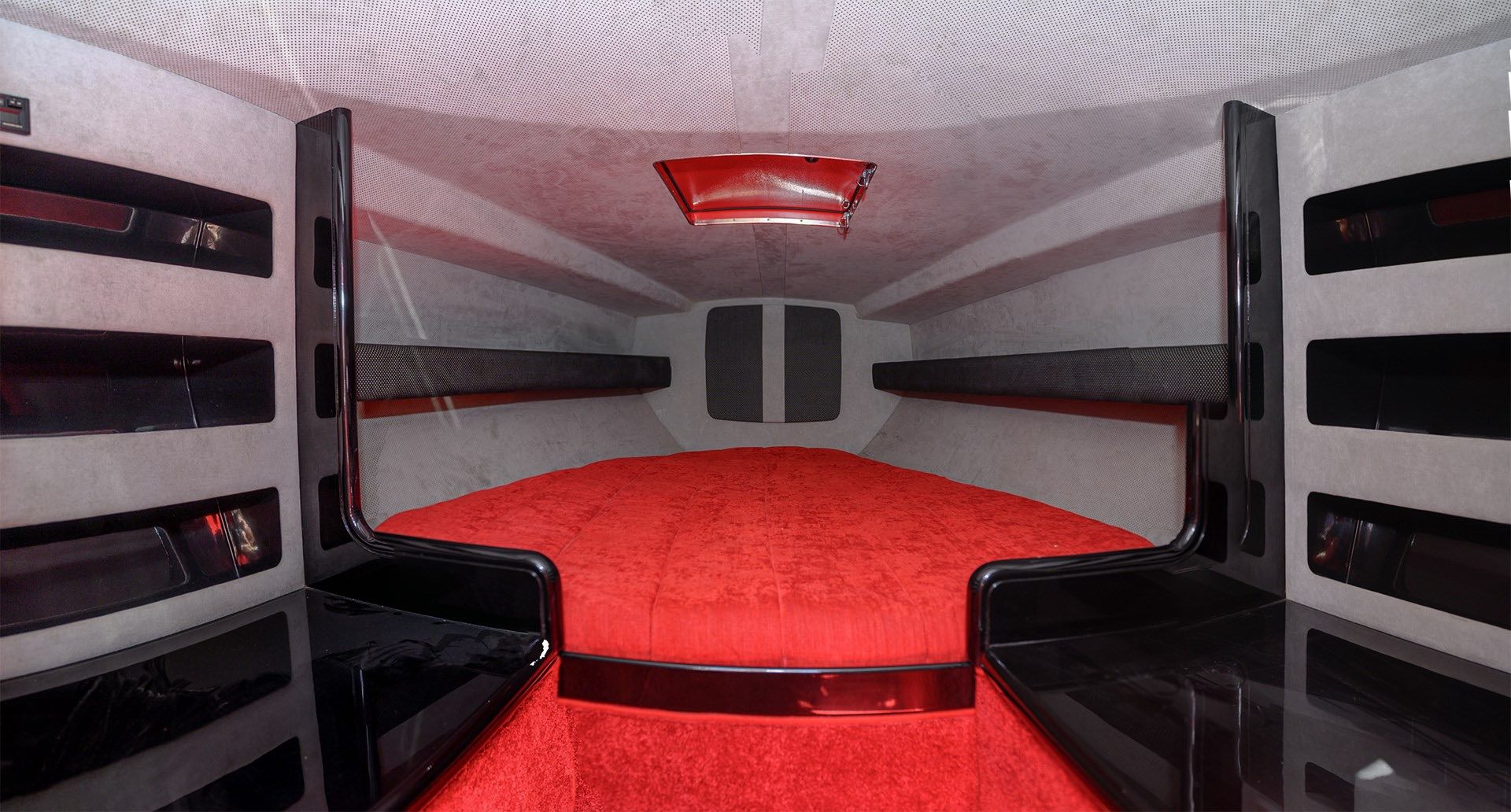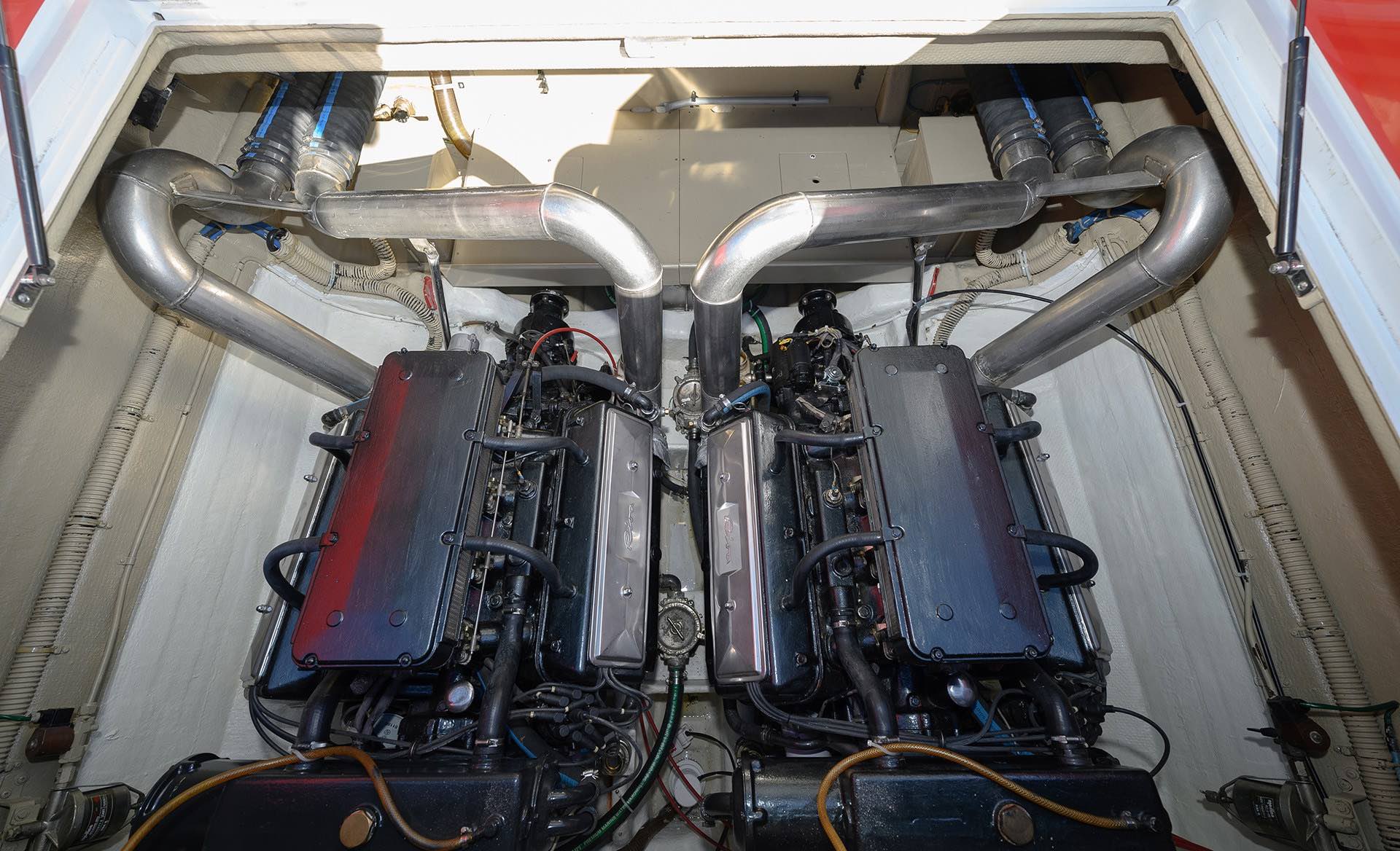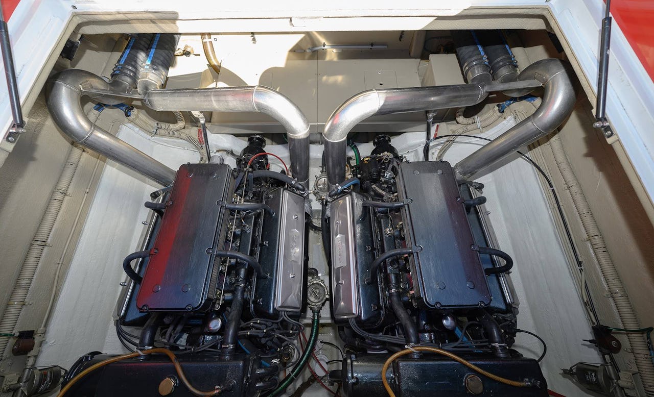 Utrustad med dubbla Vulcano V8:or (2 x 390 hk) ska den lätt och ledigt komma upp i väl över 50 knop, närmare 55 faktiskt. Under fördäcket säljer sig en dubbelkoj men inte så mycket mer.