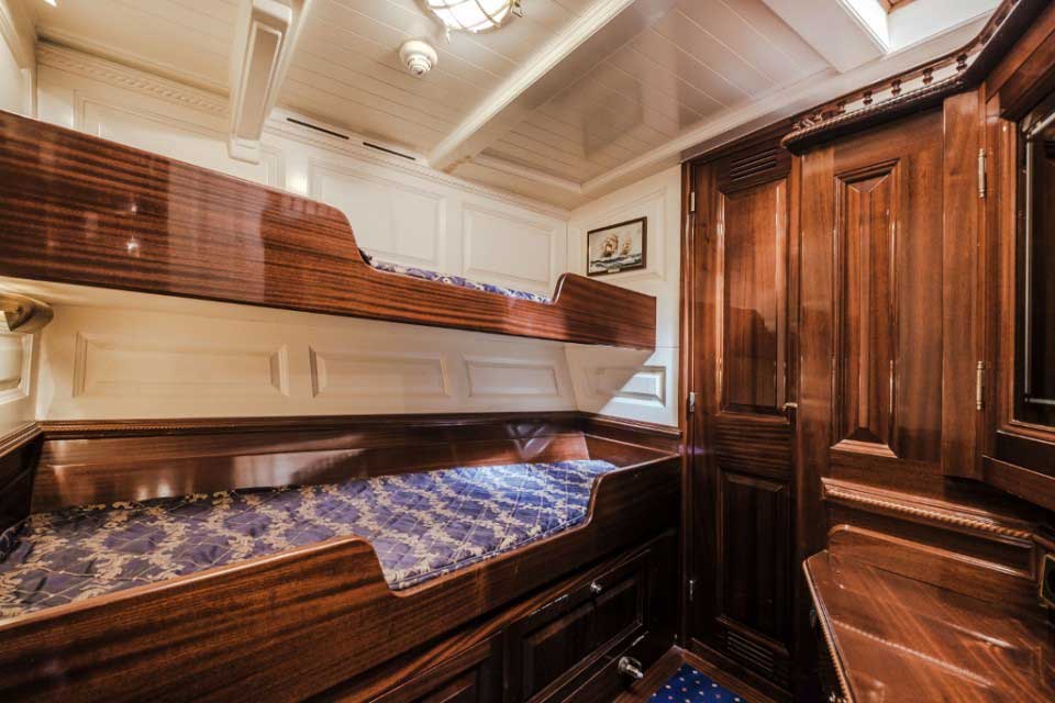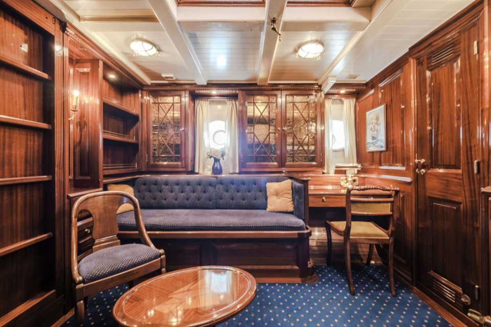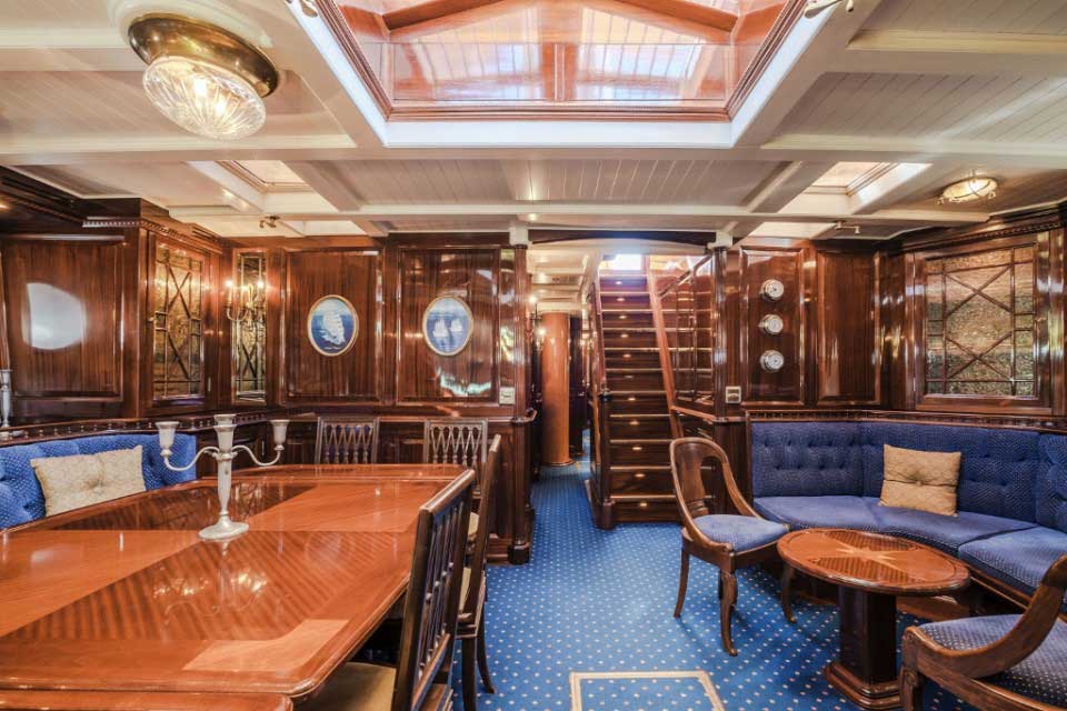 Inredningen gör knappast avkall på stil. Den som kliver ner i ruffen möts av en symfoni av fernissa, högglänsande mahogny. Skrovet har en bordläggning i teak på ekspant. Även överbyggnaden och däck är i teak eller afrikansk teak. Under renoveringen tillkom en skylight och flera fönsterventiler. Man valde i samma veva att utöka antalet gästhytter för att bekvämt få plats med tio gäster och sju besättningsmän.