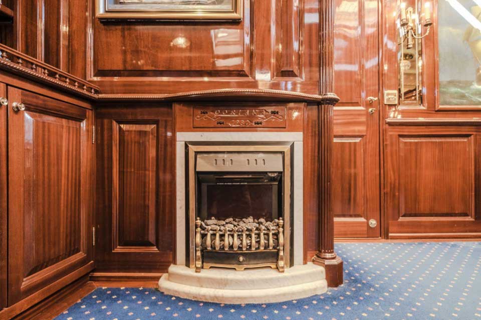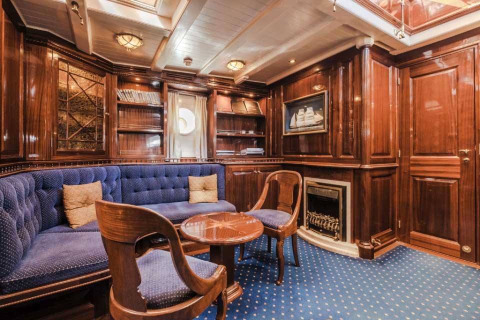 I salongen finns allt man kan tänkas behöva från en bar till bibliotek.