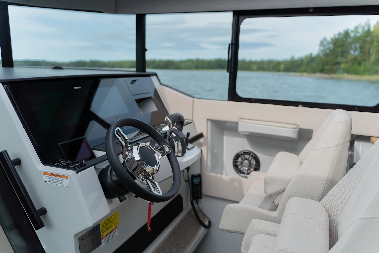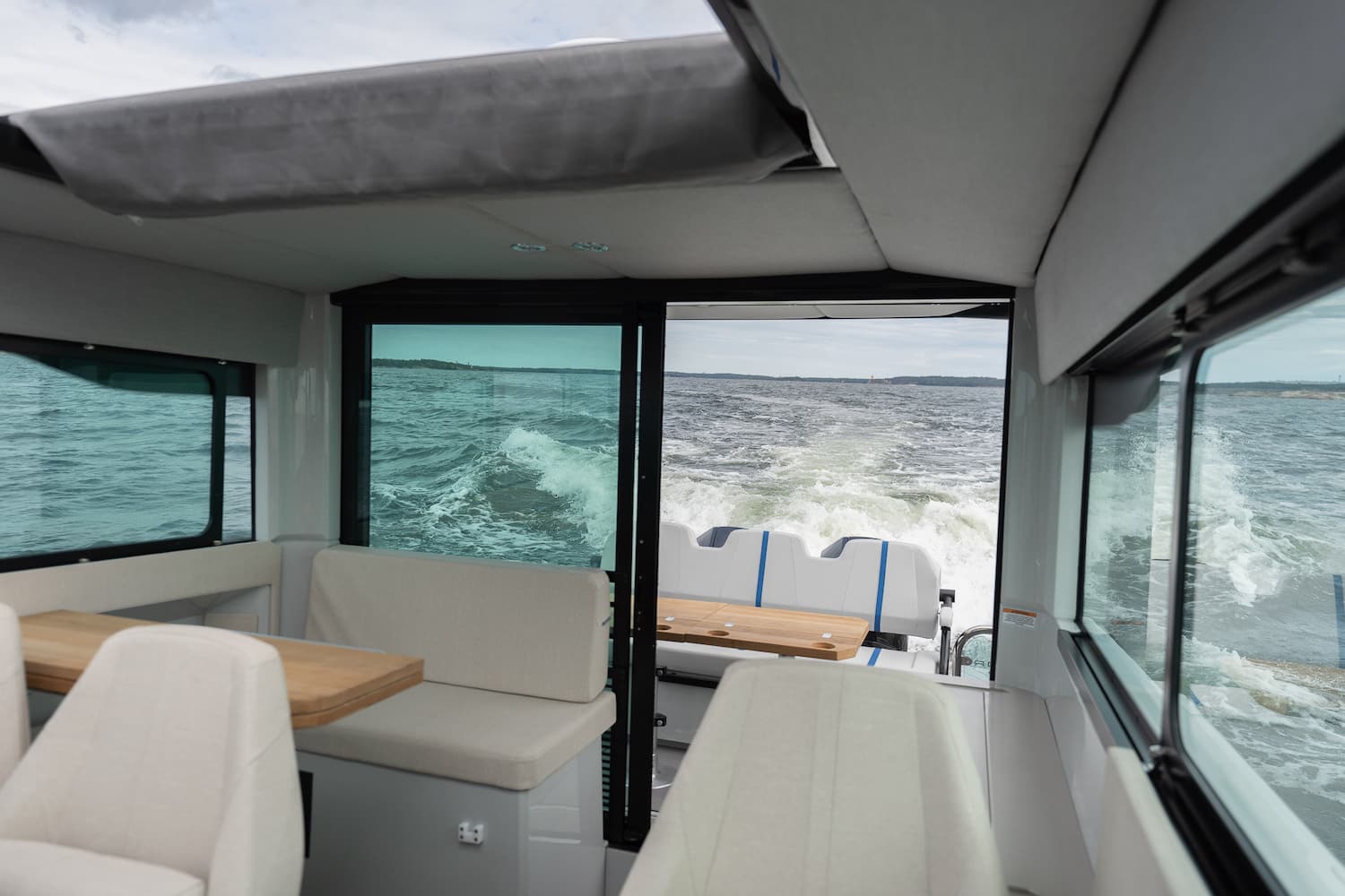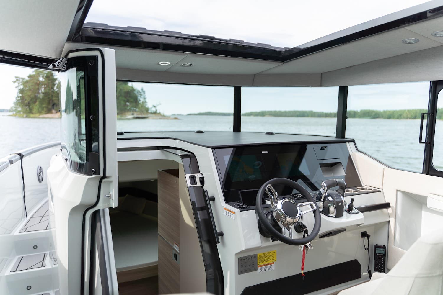 Saxdor 320 GTC är ingenting mindre än ett mellanting mellan en walkaround- och en traditionell hyttbåt med en hytt som går ända ut till skrovsidorna men med traditionellt nedsänkta gångbord framför hytten.