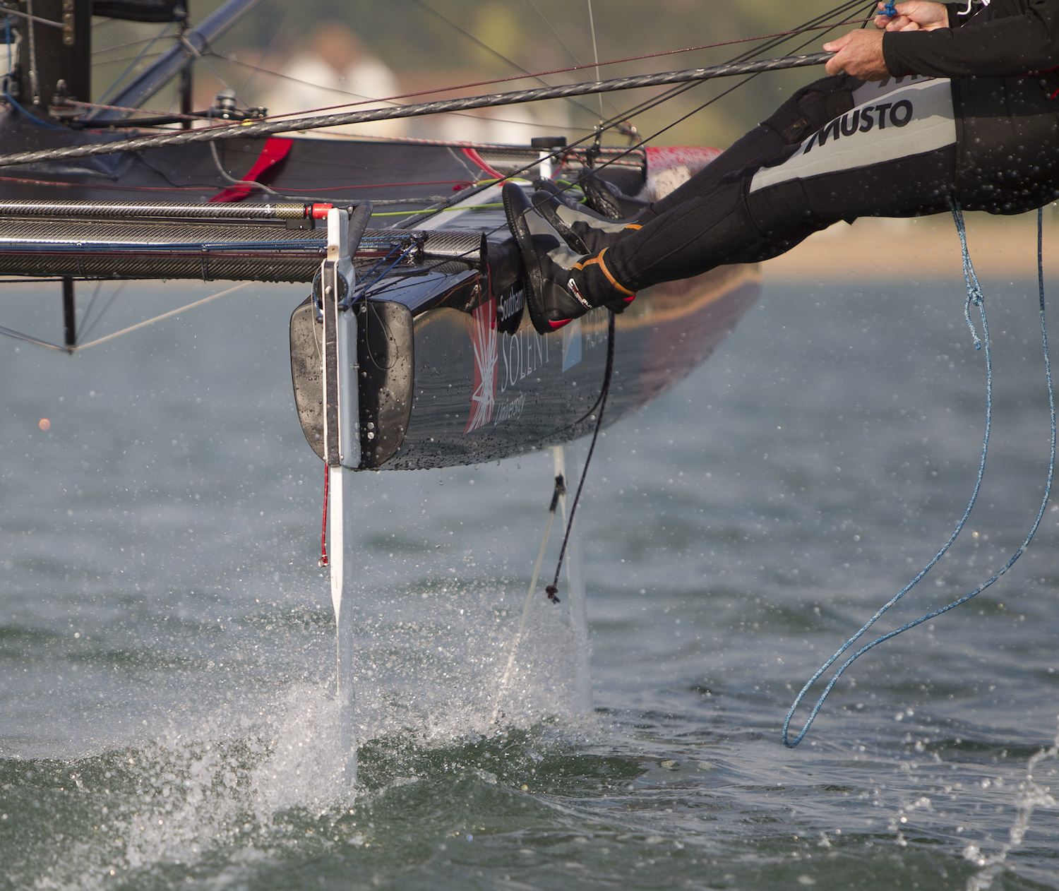 Den har sin förebild i katamaranerna som gör upp i America´s Cup. Men till skillnad från nyss nämnda bjässar så är nyheten Solent Whisper lättseglad och lyfter ur vattnet med två glada amatörer ombord i 3 m/s.