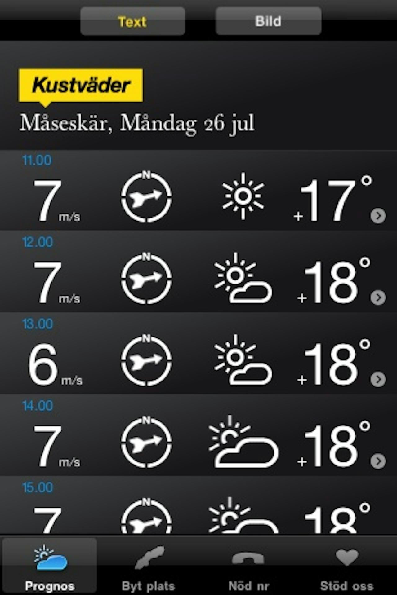 Appens väderprognoser levereras av SMHI och YR. Prognoser och vädervarningar utfärdas och uppdateras sex gånger per dygn och visar lokalt väder från Skagerack och Kattegatt till Norra Bottenhavet, och i Vänern och Vättern. Sjörapporten som finns i appen är densamma som Sveriges Radio sänder.