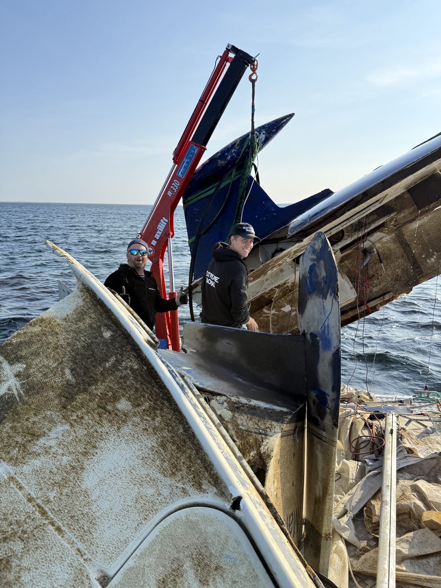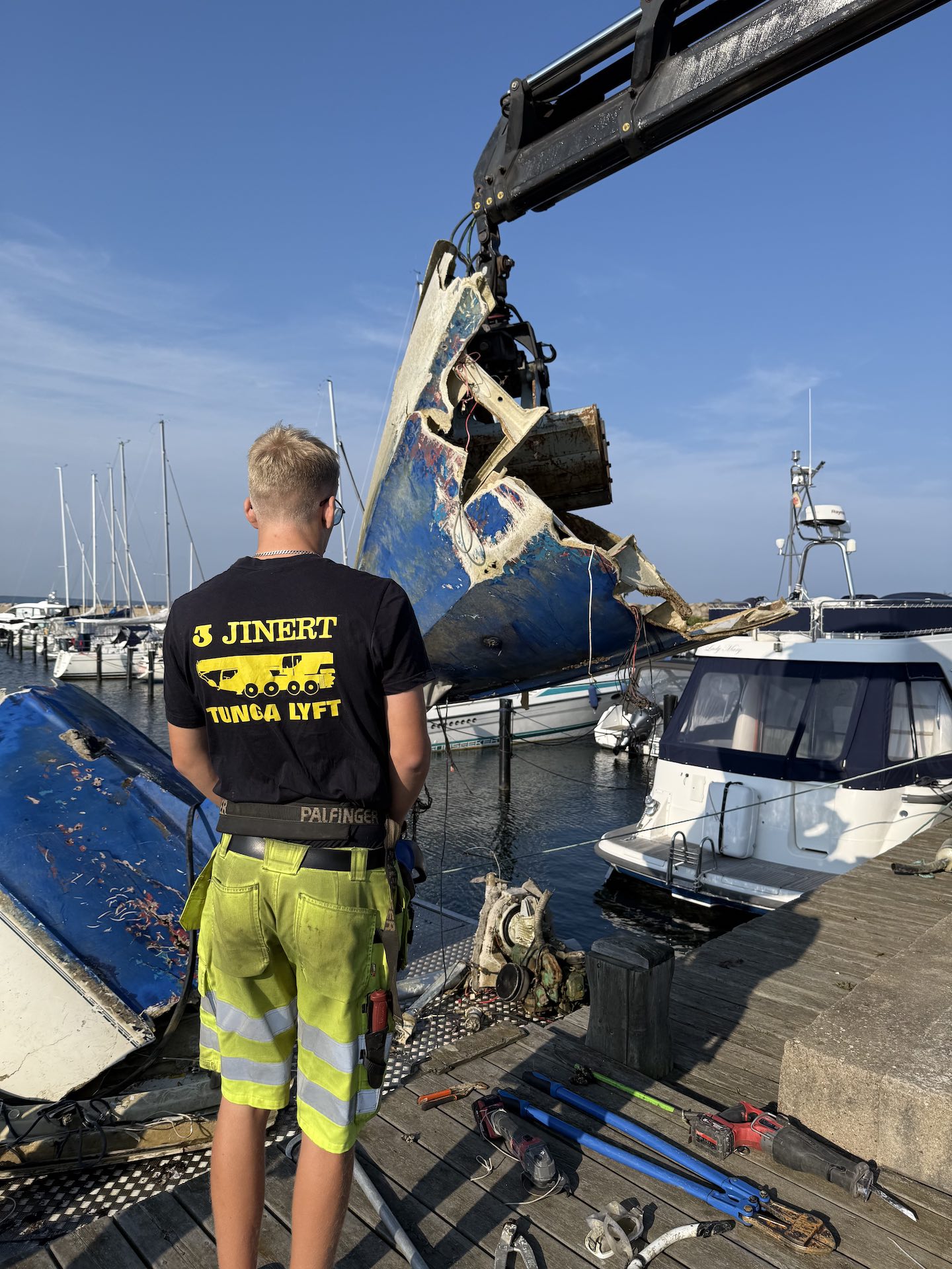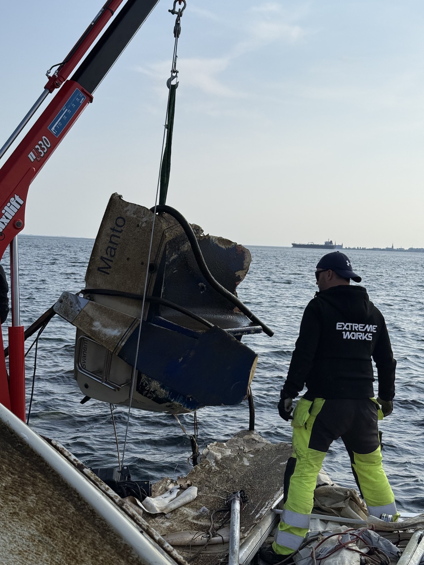 Sjöassistans i full färd med bärgningen av den Maxi 77:a som seglade på en sjunken dansbana utanför Laröd strax norr om Helsingborg.