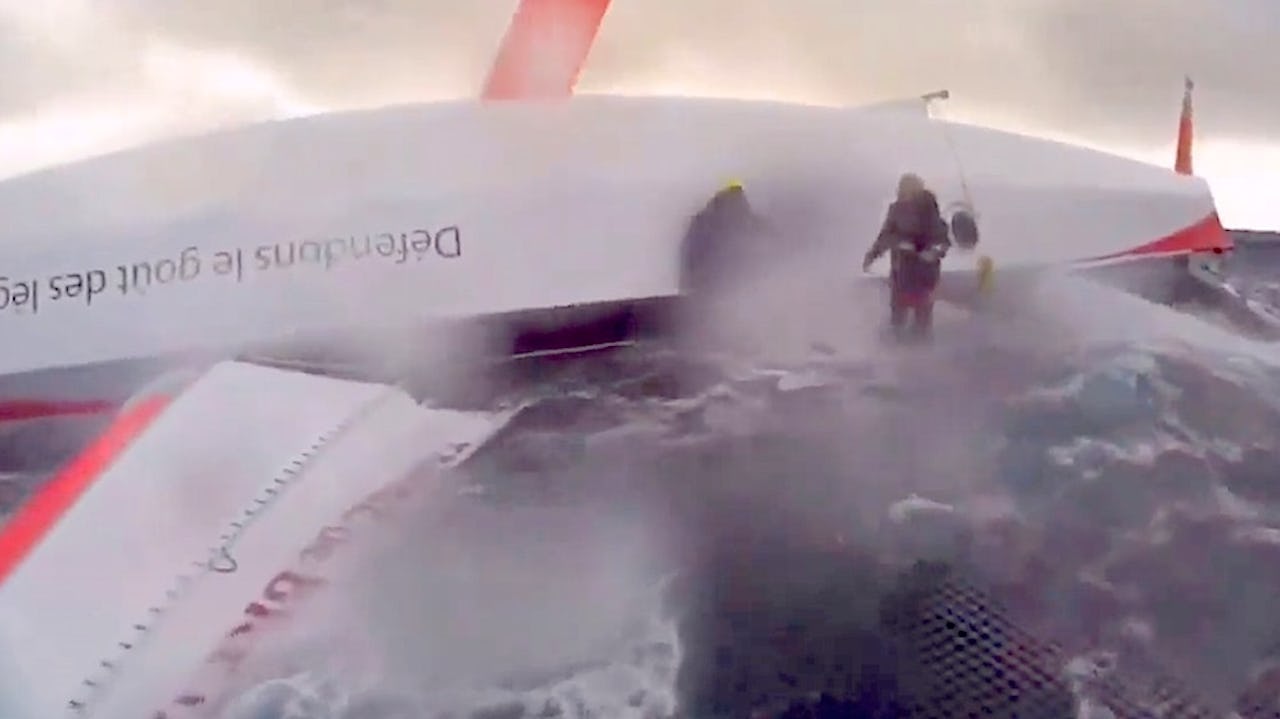 Besättningsmännen Lionel Lemonchois och Roland Jourdain hoppades att de skulle klara att lösa situationen inom sitt eget team och stannande ombord på sin kapsejsade trimaran i ett dygn (en trimaran är ju mest stabil uppochner). Men då väderutsikterna försämrades kallade de på hjälp.