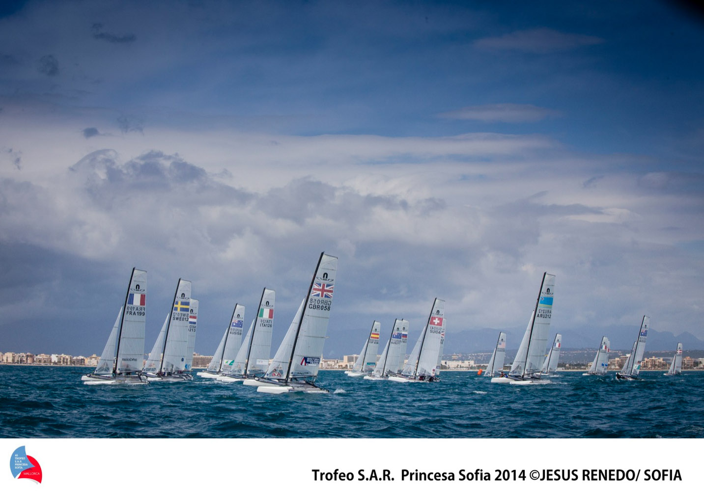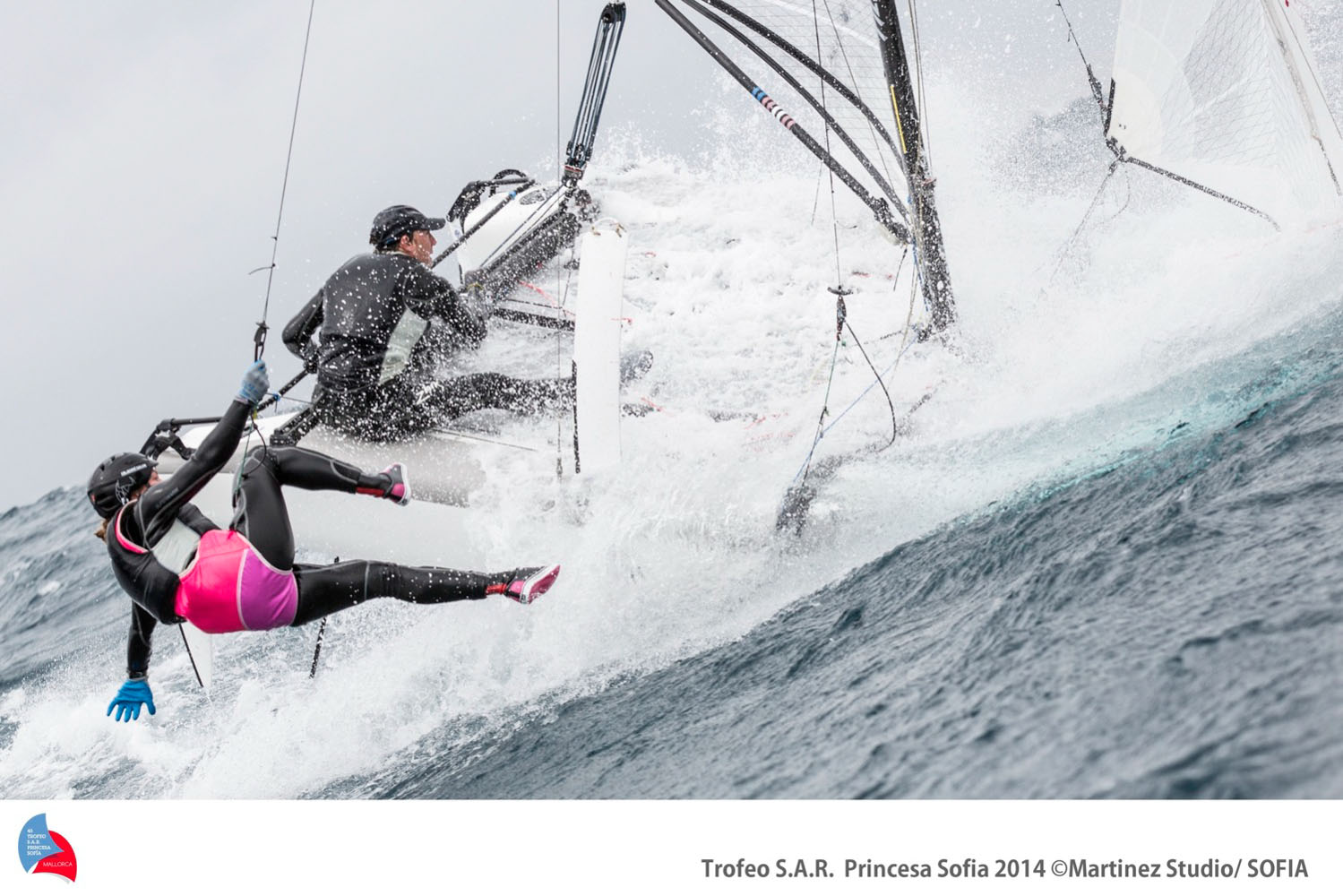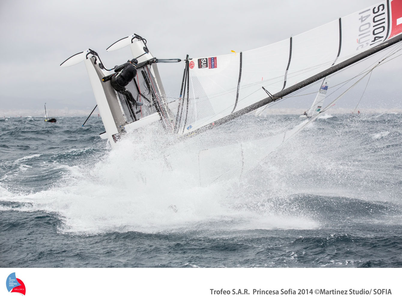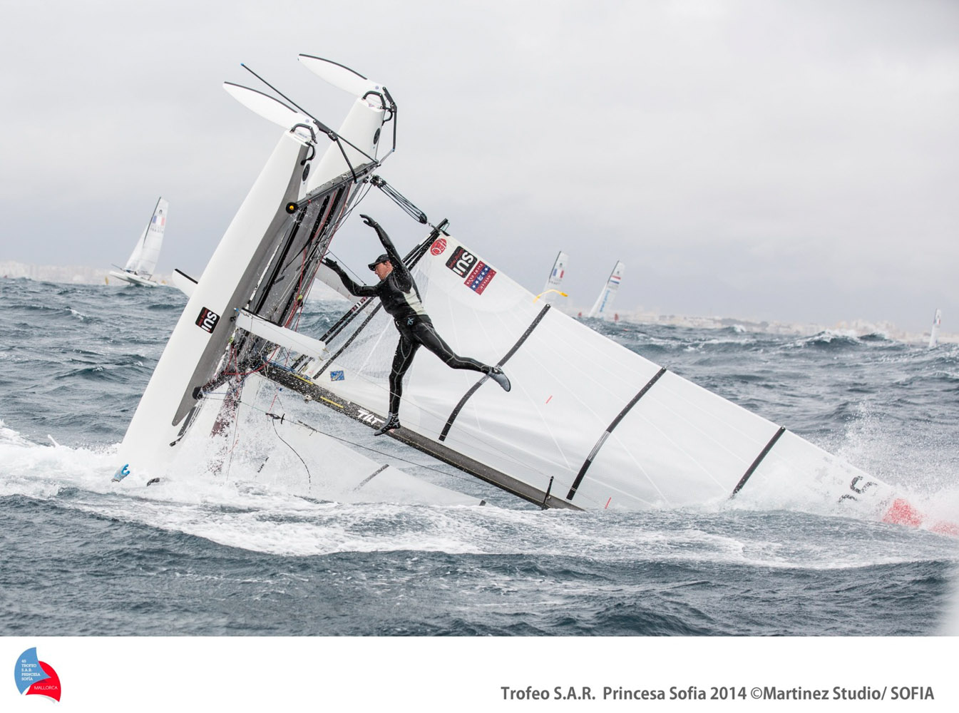 Den här dagen utanför Mallorca bekymrade sig besättningarna nog mer över att hålla båtarna på rätt köl än att få upp ordentlig fart. De böjda centerborden ger mycket lyft och omvandlar kraften som vill trycka ner båten under ytan till framåtdrivande kraft. Men bara till en viss gräns. När det blåser så att paraplyer pajar och vågtopparna täcker startbåtarna är det en konst att inte dyka när man faller av vid rundningarna.