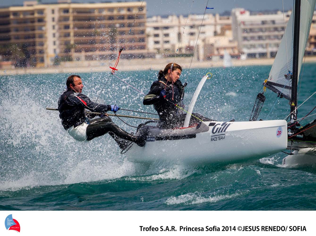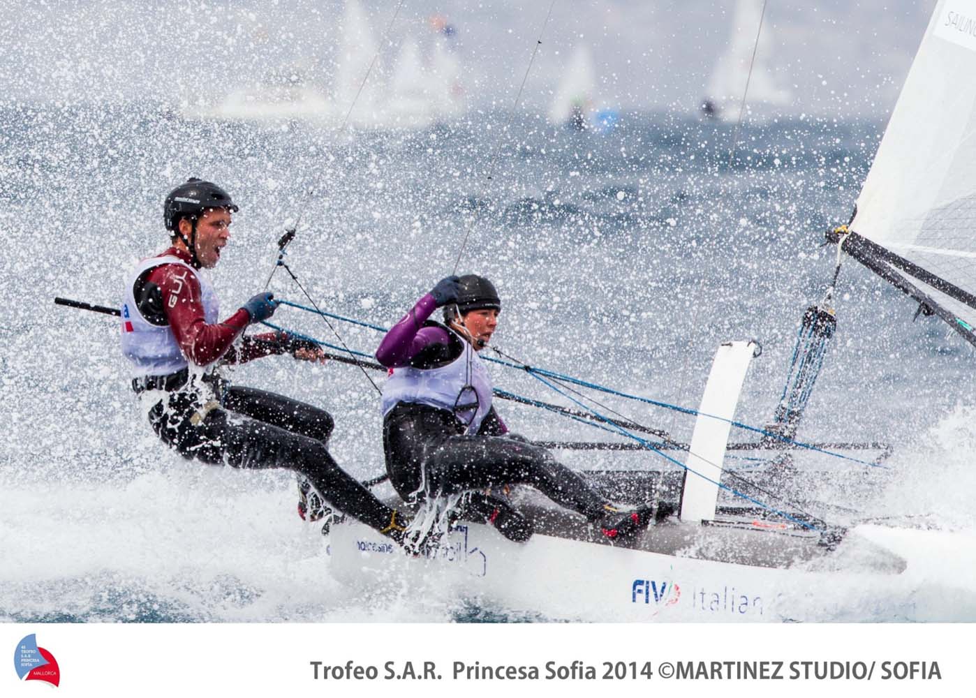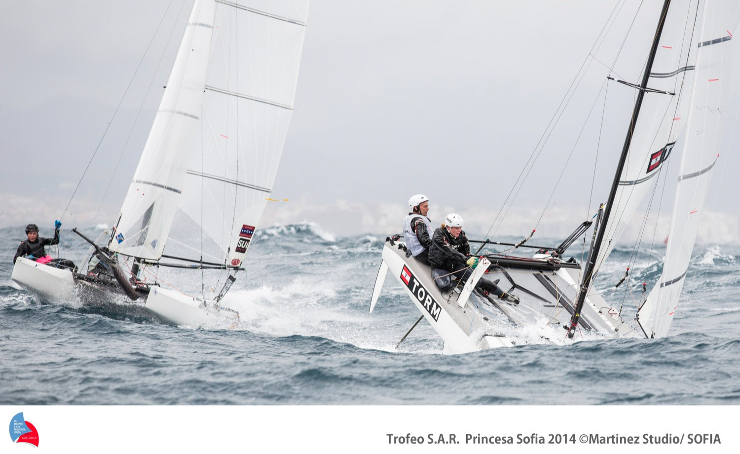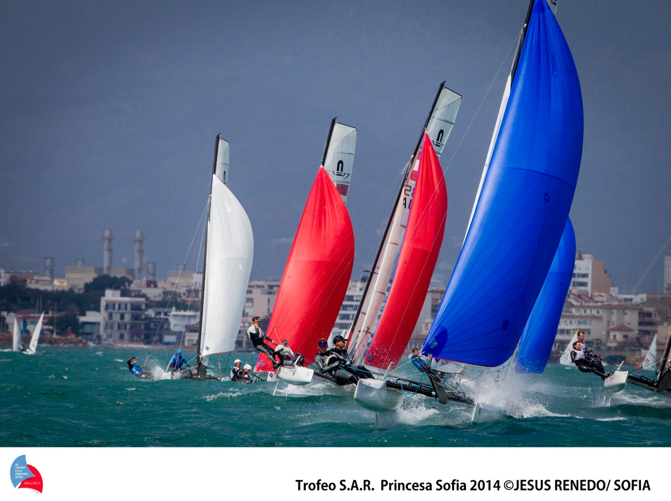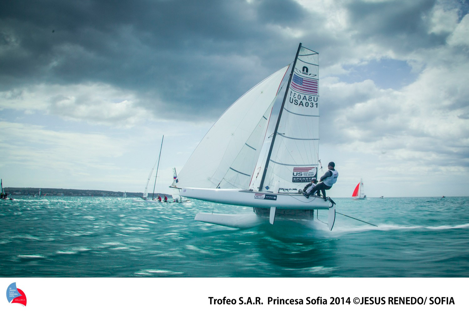 Den här dagen utanför Mallorca bekymrade sig besättningarna nog mer över att hålla båtarna på rätt köl än att få upp ordentlig fart. De böjda centerborden ger mycket lyft och omvandlar kraften som vill trycka ner båten under ytan till framåtdrivande kraft. Men bara till en viss gräns. När det blåser så att paraplyer pajar och vågtopparna täcker startbåtarna är det en konst att inte dyka när man faller av vid rundningarna.