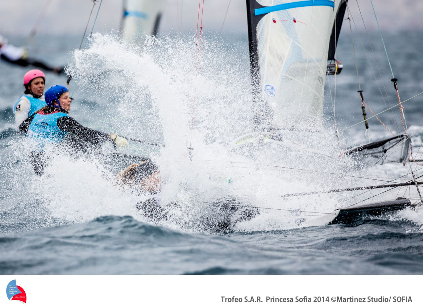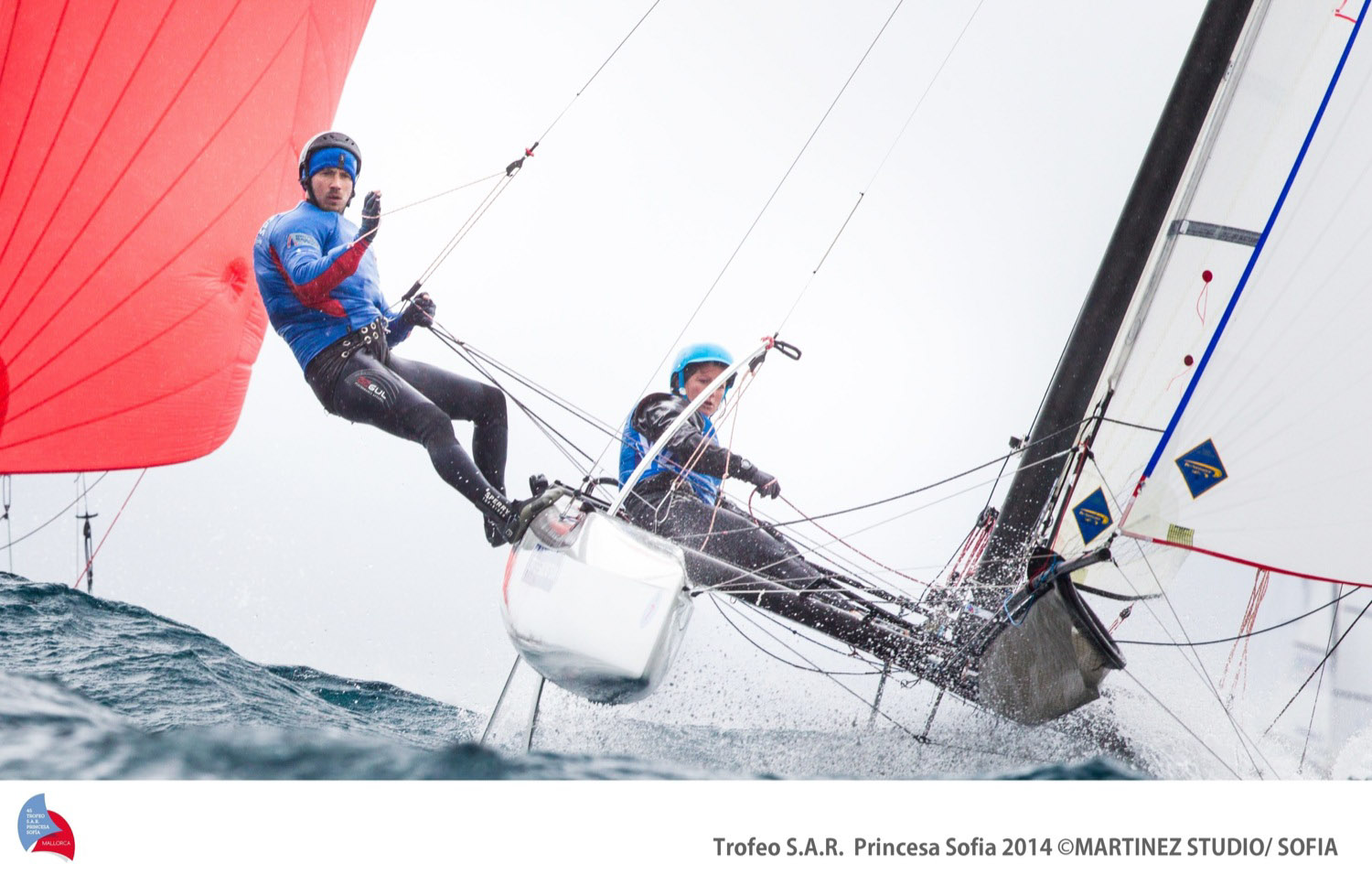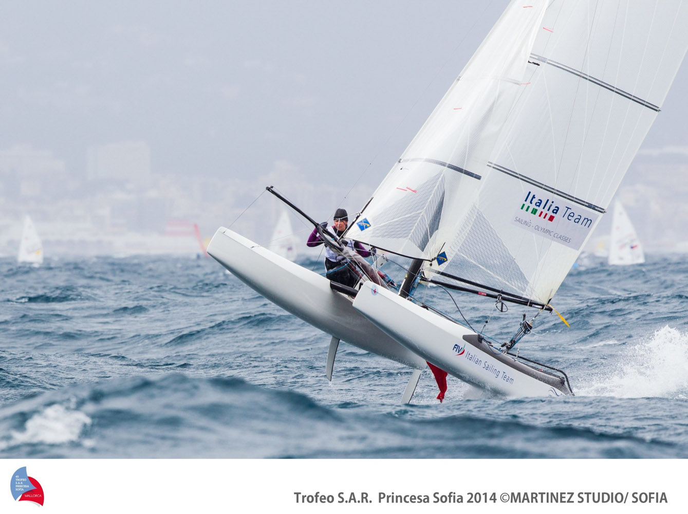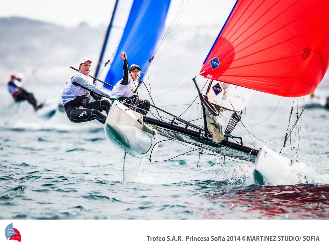 Den här dagen utanför Mallorca bekymrade sig besättningarna nog mer över att hålla båtarna på rätt köl än att få upp ordentlig fart. De böjda centerborden ger mycket lyft och omvandlar kraften som vill trycka ner båten under ytan till framåtdrivande kraft. Men bara till en viss gräns. När det blåser så att paraplyer pajar och vågtopparna täcker startbåtarna är det en konst att inte dyka när man faller av vid rundningarna.