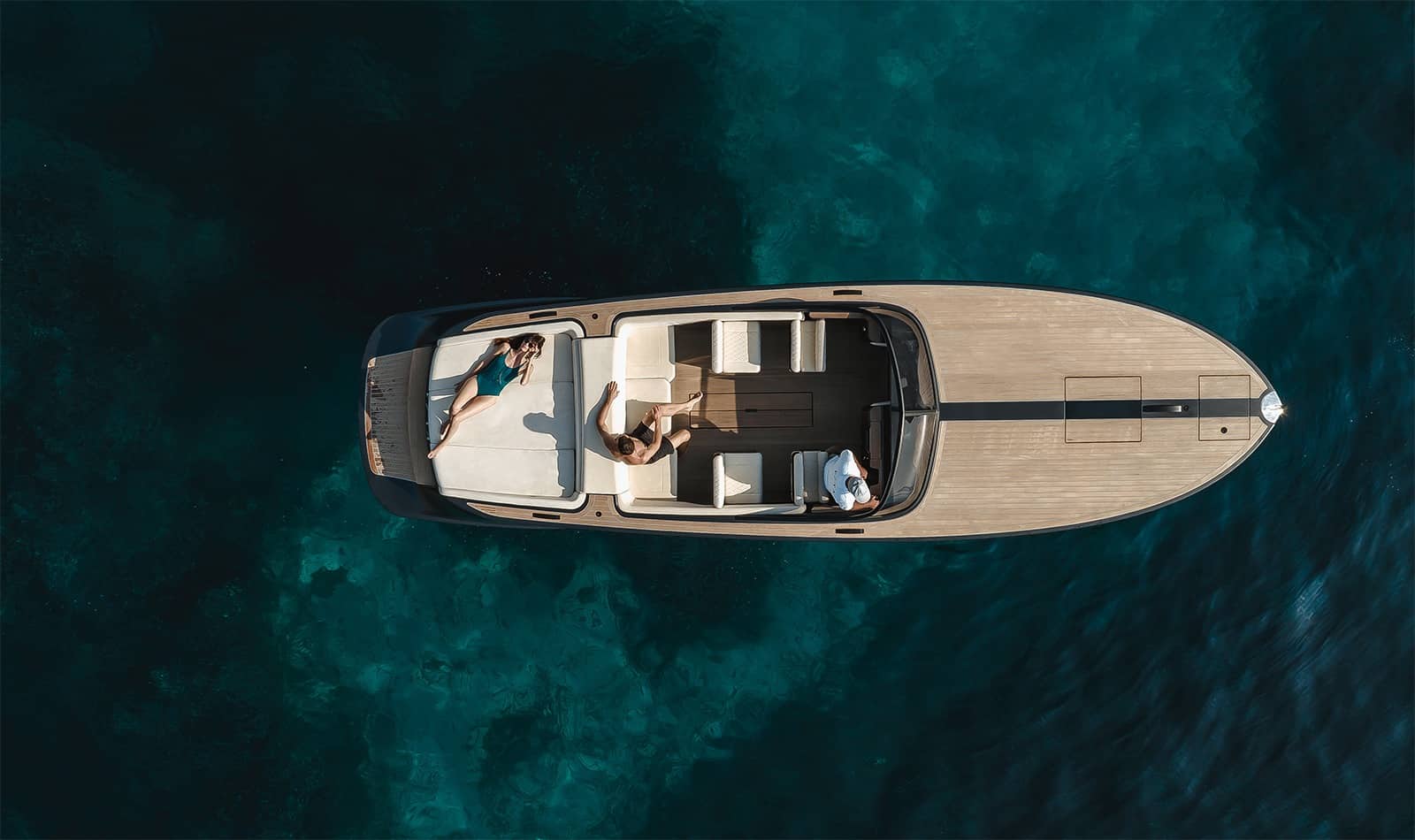 I övrigt präglas båten av till synes högklassiga snickerier i teak med detaljer i aluminium och – om man får tro tillverkaren – så ska båten vara en ljudlös fröjd att köra.