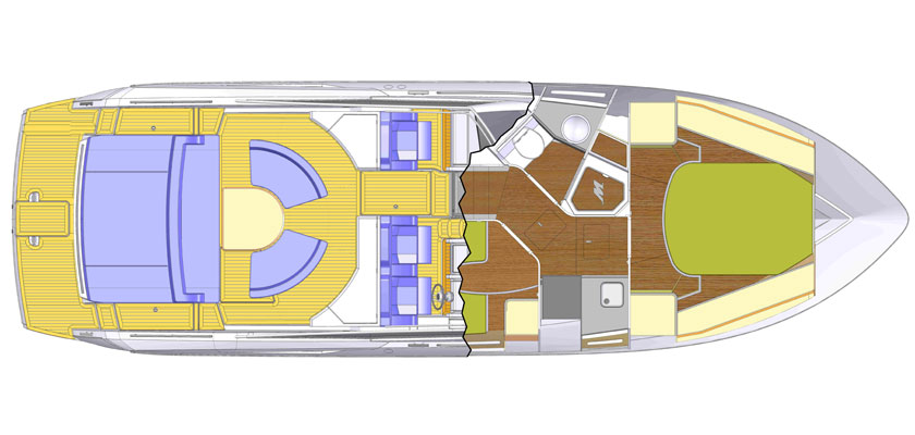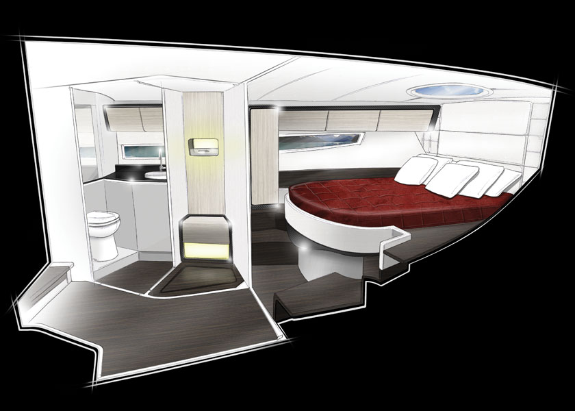 För att vara en 39-fotare med ett komfortabelt inre har den också ganska aggressiv prestanda. Med dubbla Volvo Penta-dieslar på 370 hästar toppar den 45 knop och ska lätta kunna hålla 38 knop i snitt med en räckvidd på 270 sjömil.