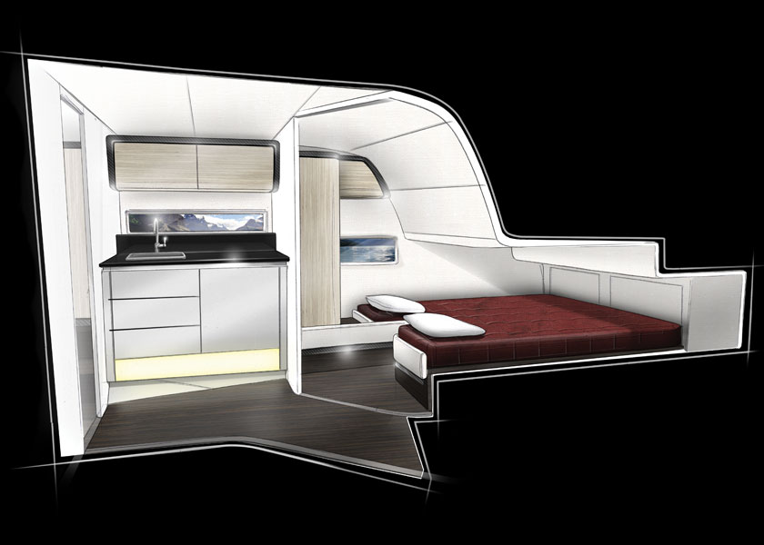 Invändigt finns två kabiner som är ambitiöst designade av brittiska Design Unlimited med laserad ek och svartlackade ytor. Den har ovanligt stora fönster i skrovsidorna som lär ge fint ljusinsläpp, ett rejält toautrymme, pentry, en härlig dubbelkoj i fören och två singelbäddar i aktern.