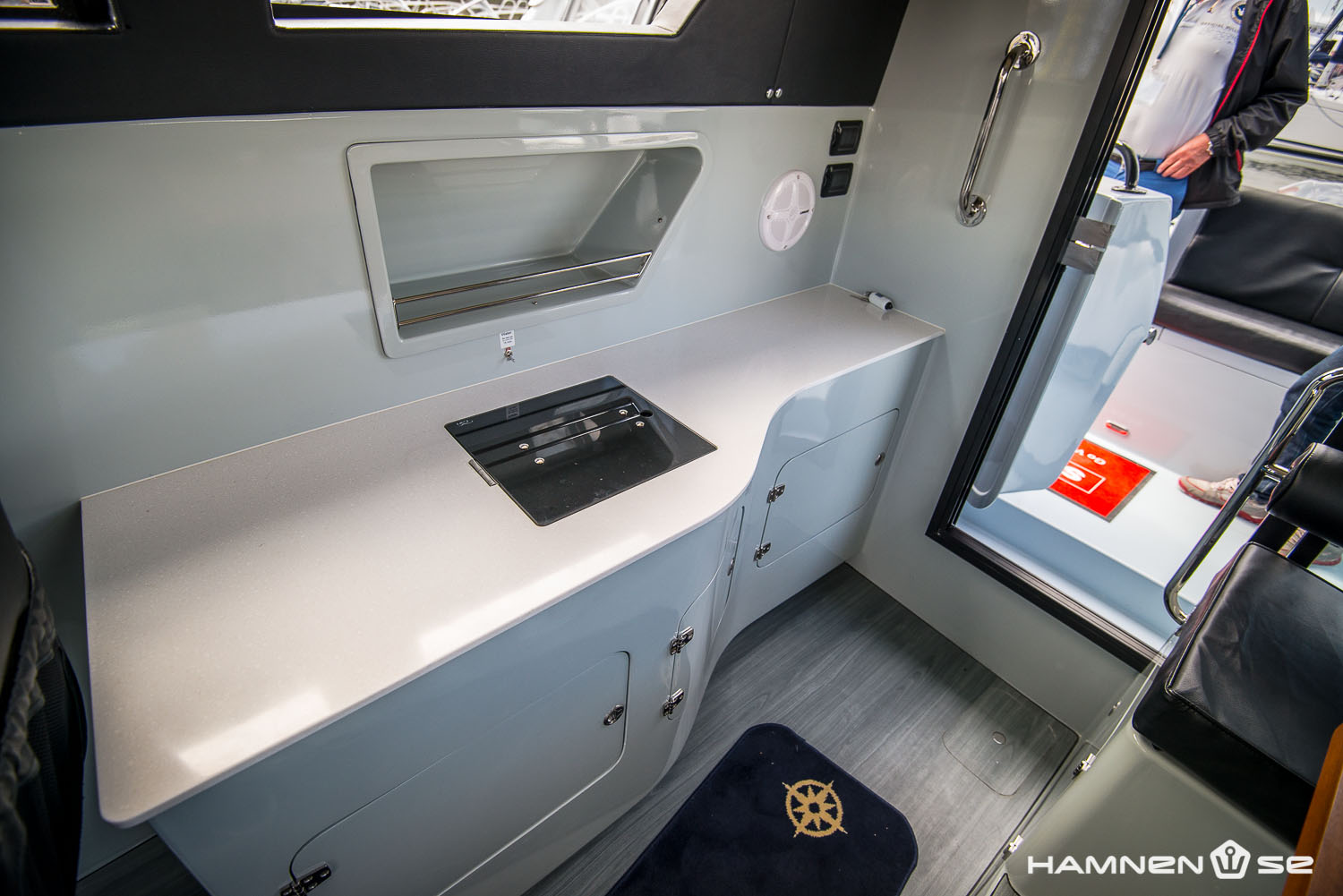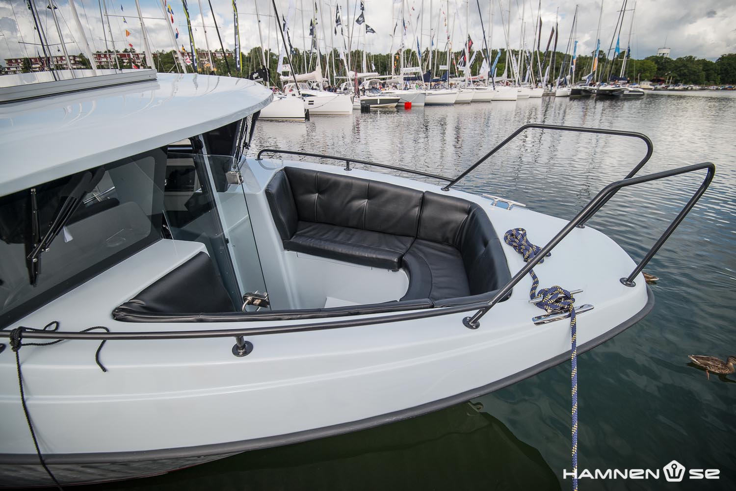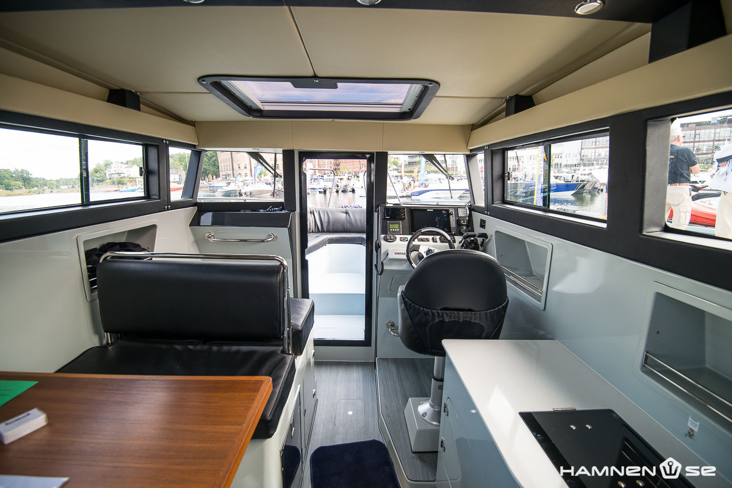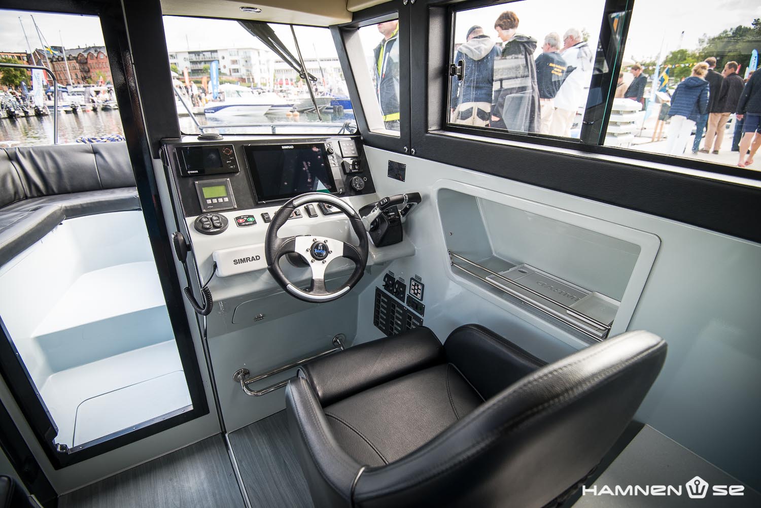Vidare är sikten runt om kring ganska begränsad på grund av de minimala fönsterrutorna och att hitta en bra körställning är heller inte lätt. Däremot har detta visningsexemplar finesser som VHF, en bra värmare, backkamera, bogpropeller och ett litet kylskåp. Dessutom kammar båten hem pluspoäng för sin jättelika U-soffa i fören. Likaså för dörren i skrovsidan som är guld värd om man ska baxa ombord någonting otympligt från vattnet.