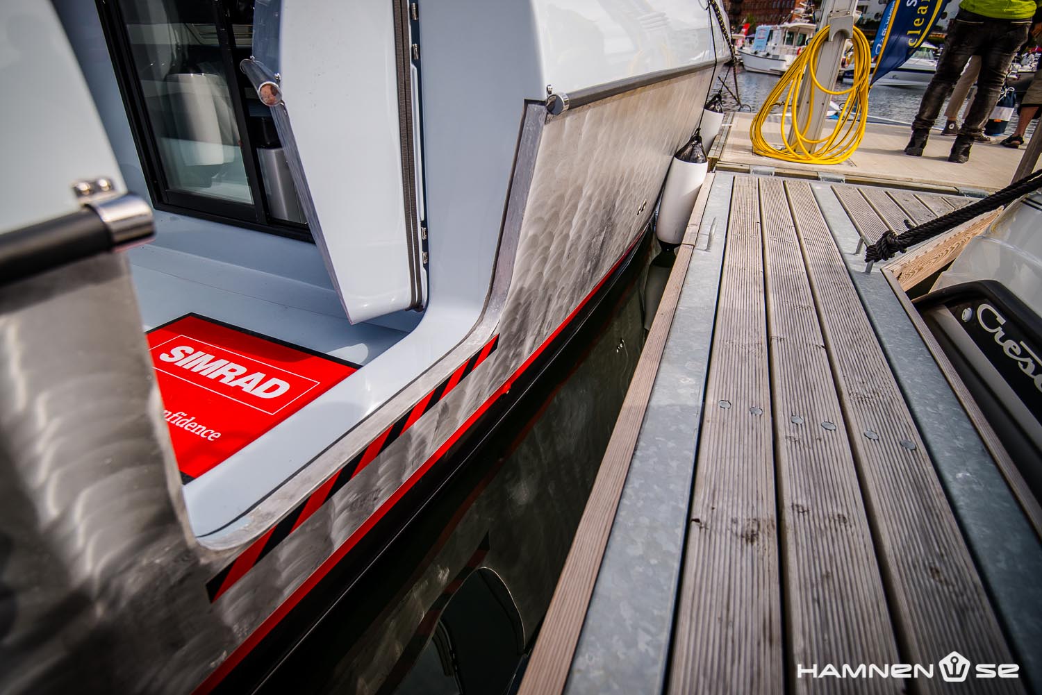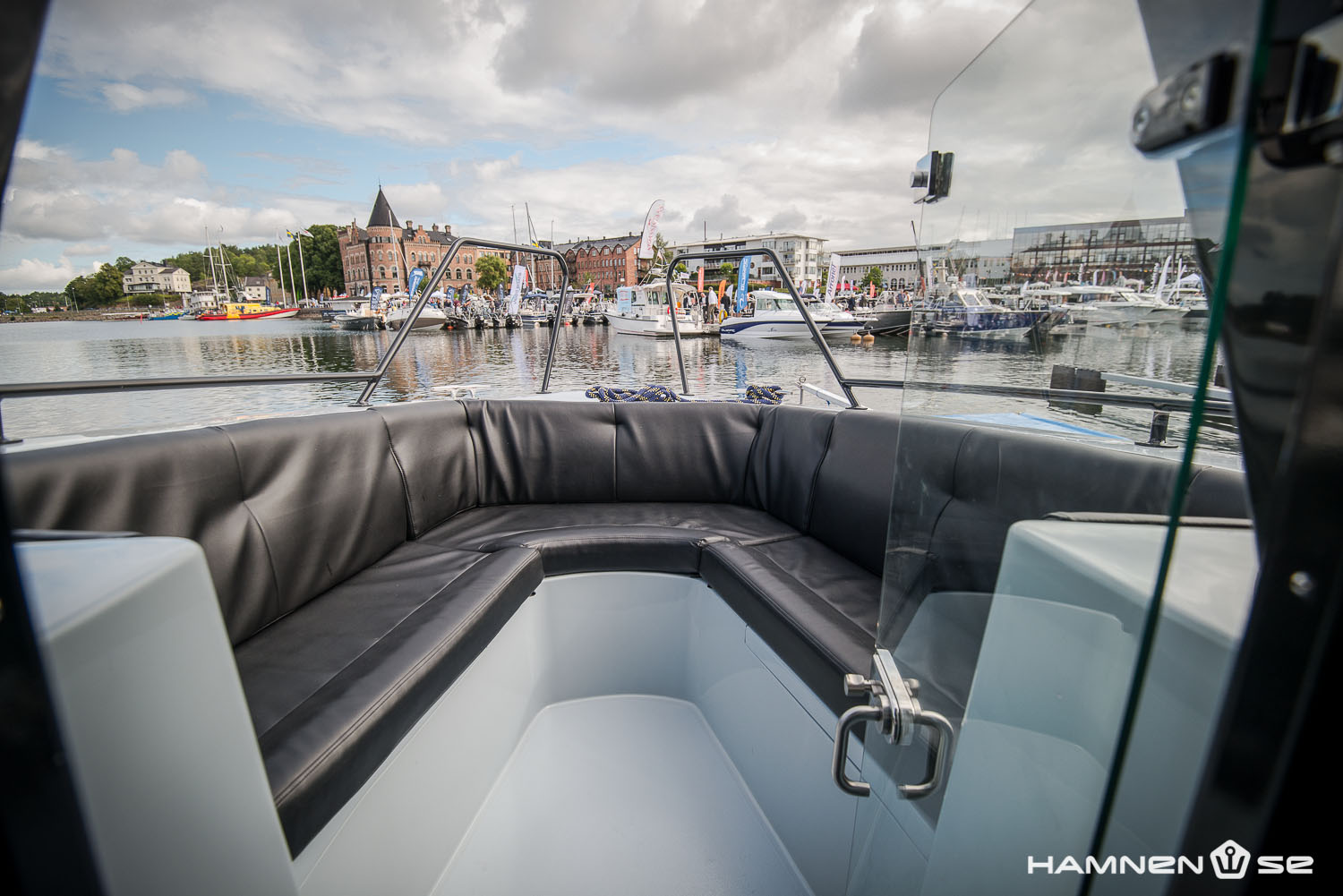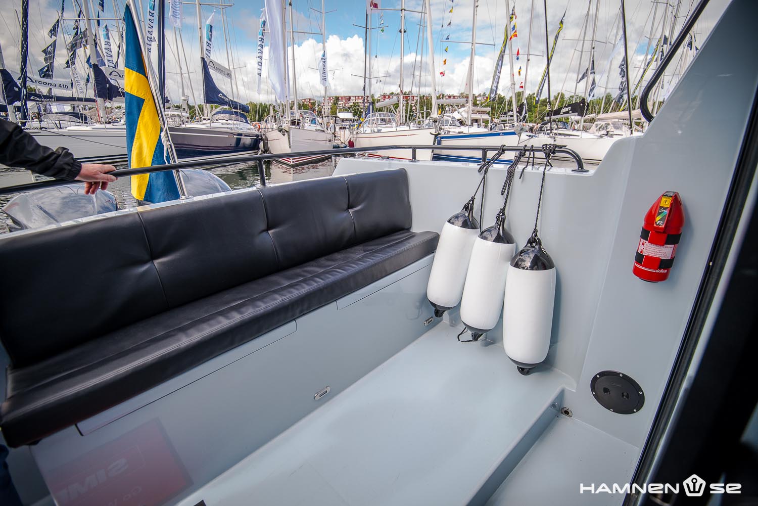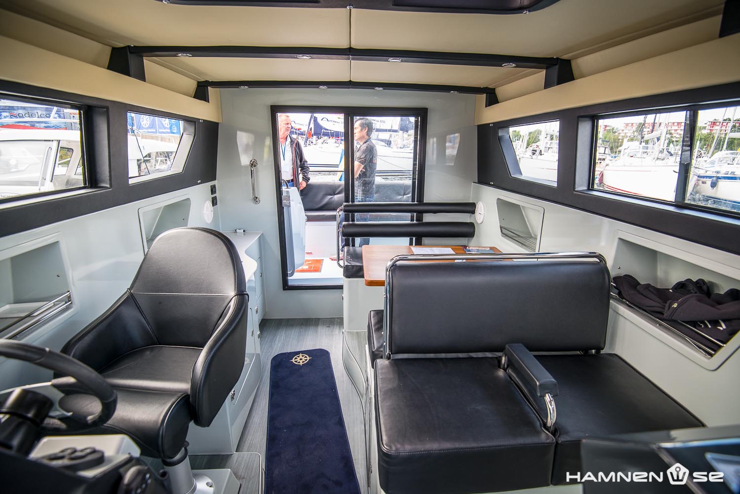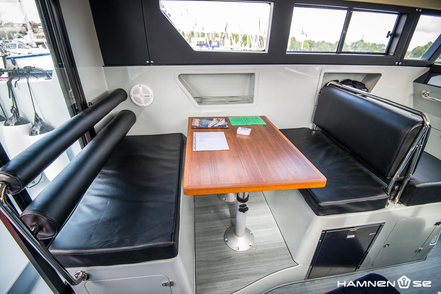 Vidare är sikten runt om kring ganska begränsad på grund av de minimala fönsterrutorna och att hitta en bra körställning är heller inte lätt. Däremot har detta visningsexemplar finesser som VHF, en bra värmare, backkamera, bogpropeller och ett litet kylskåp. Dessutom kammar båten hem pluspoäng för sin jättelika U-soffa i fören. Likaså för dörren i skrovsidan som är guld värd om man ska baxa ombord någonting otympligt från vattnet.