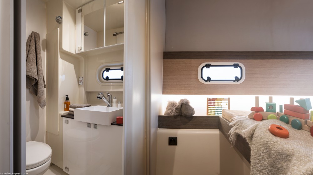 I grundutförande bjuds här tre sovhytter med dubbelkojer samt två separata våtutrymmen med toalett och dusch. Ovanpå detta tronar salongen där känslan av att befinna sig i en modern lägenhet inte är långt borta.