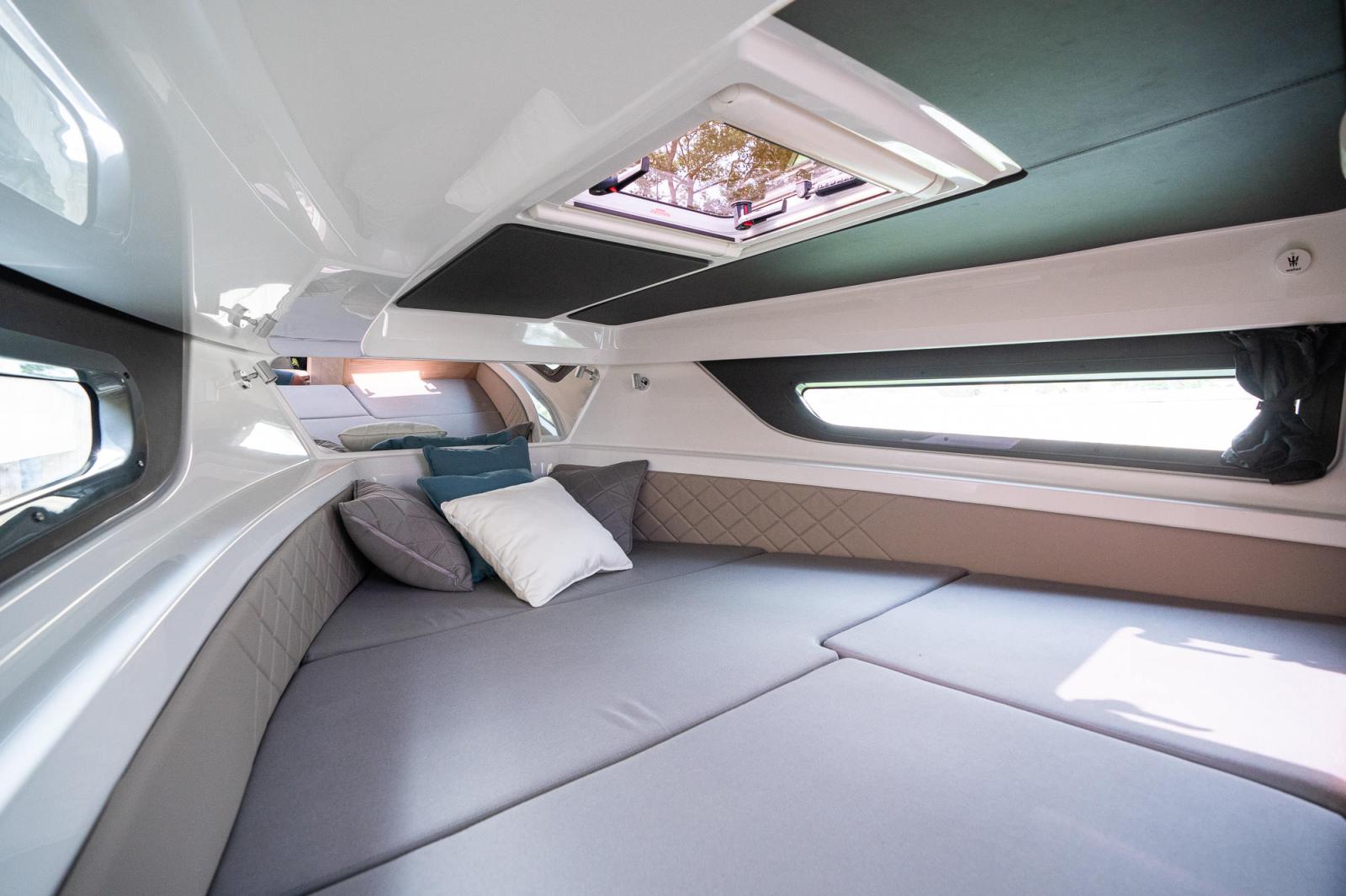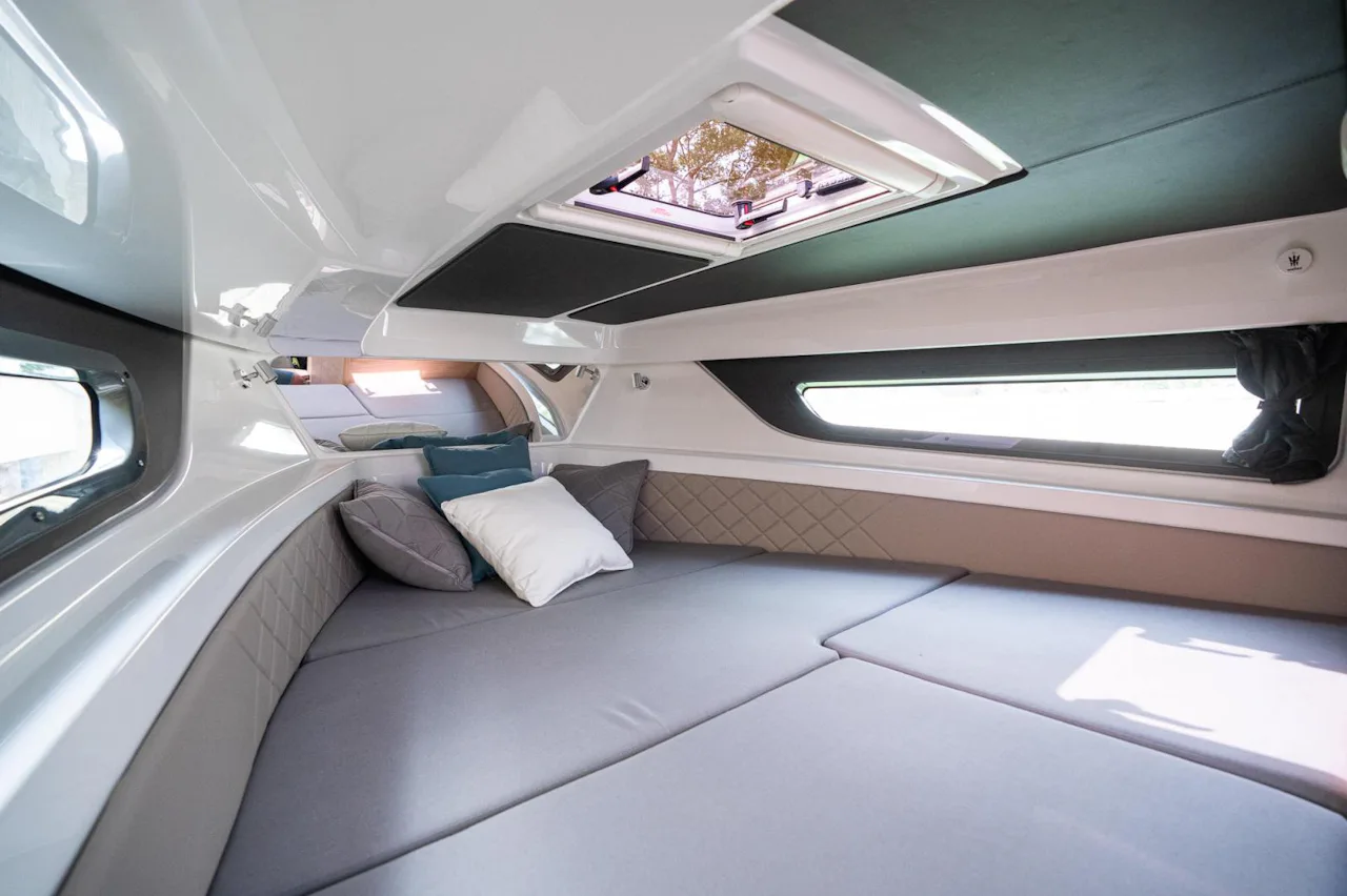 Vad sägs till exempel om att sittbrunnen rymmer hela åtta personer och där aktersoffans ryggstöd kan också fällas ned och förvandlas till en rejäl solbädd? Här finns också finns fullfjädrat pentry med spis, kylskåp, diskho och förvaringsutrymme utan att det känns det minsta trångt.