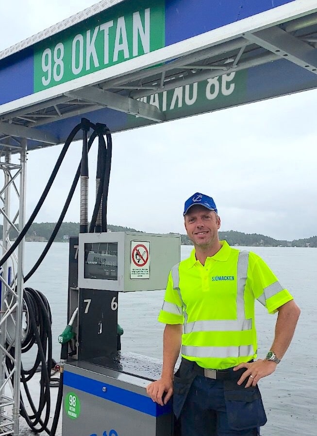 Alexander von Hueck på Sjömacken Vaxholm har valt att inte sälja den nya 95-oktaniga E10-bensinen utan erbjuder 98-oktanig bensin istället.