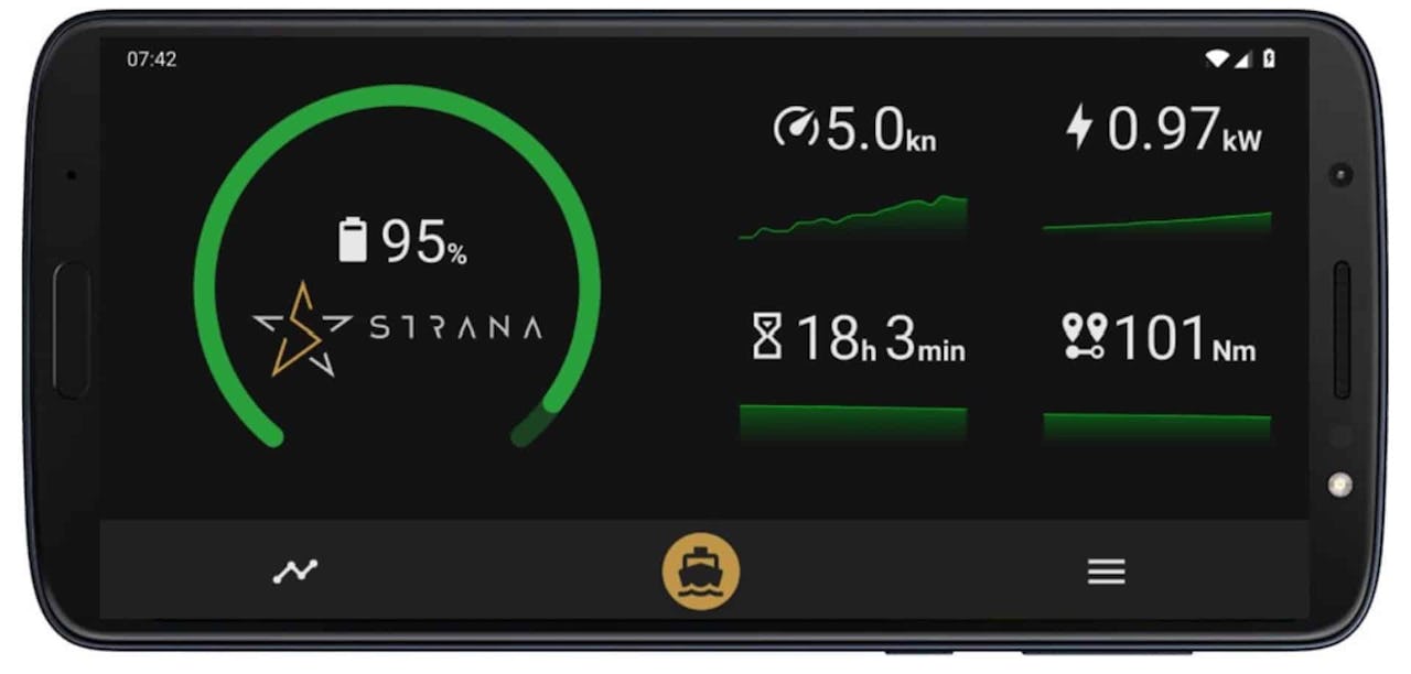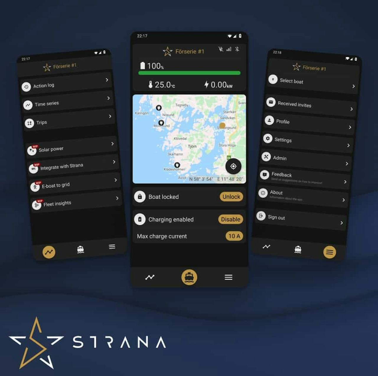 Med Stranas app är båtägaren ständigt uppkopplad med båten. Under körning visas energiåtgång och räckvidd. I hamn kan appen styra laddningen. Det är också möjligt att dela båten då appen kan ge access till andra.
