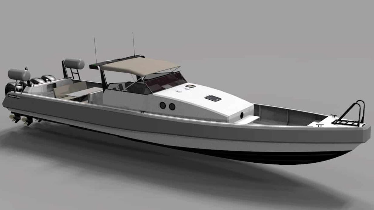 Ett nästan 15 meter långt och sylvasst stegbottenskrov i aluminium med 4 x 400 hk där bak. Känn på den! Vector ProBoat...