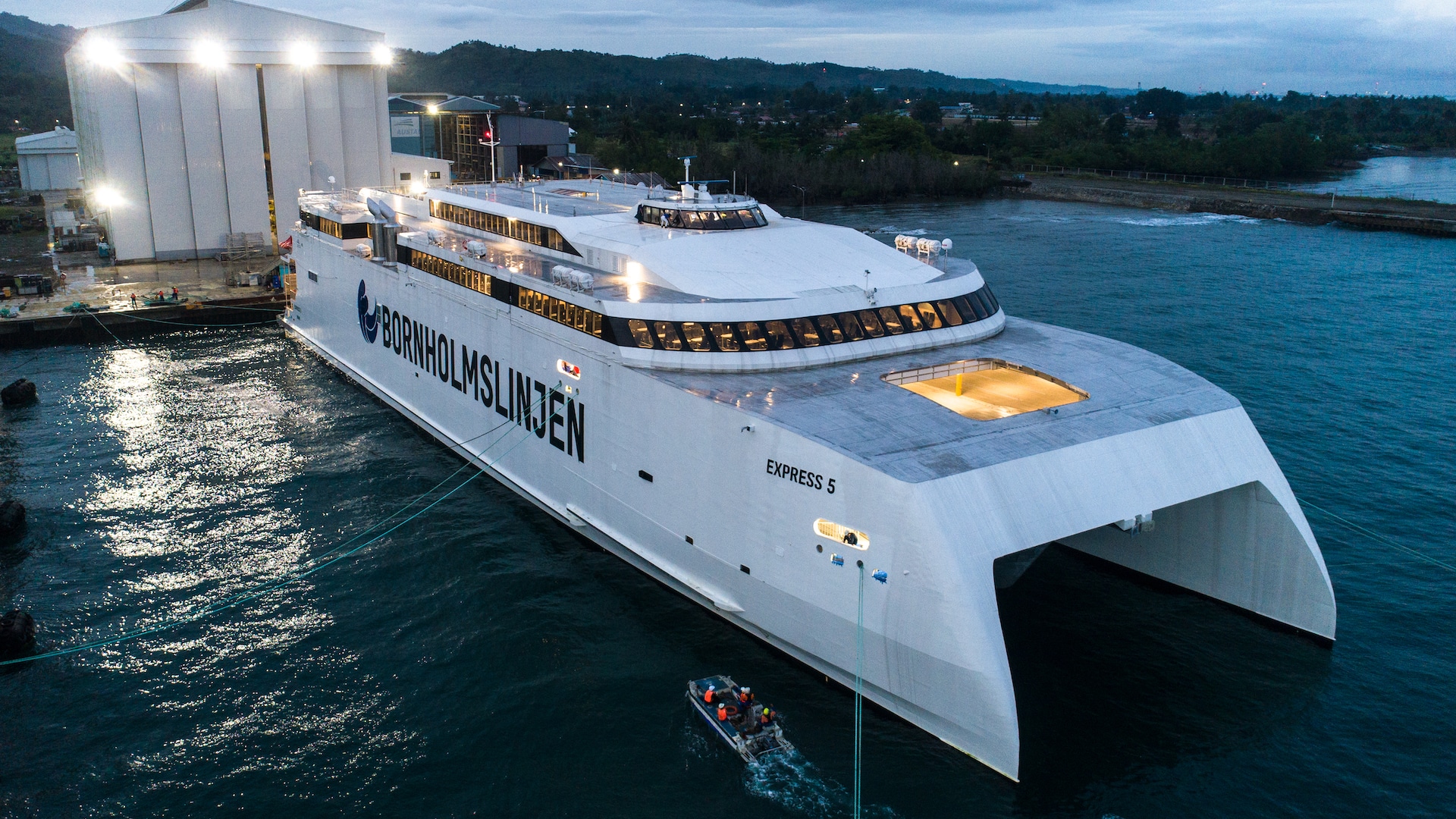 Med 53 000 hk går det i ilfart från Ystad till Rönne. Bornholmslinjens nya färja slår rekord som den största katamaranen av...