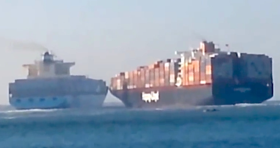 En amatörvideo visar när ett tyskt och ett singaporianskt fartyg kolliderar vid det nordliga inloppet till en av världens mest trafikerade leder...