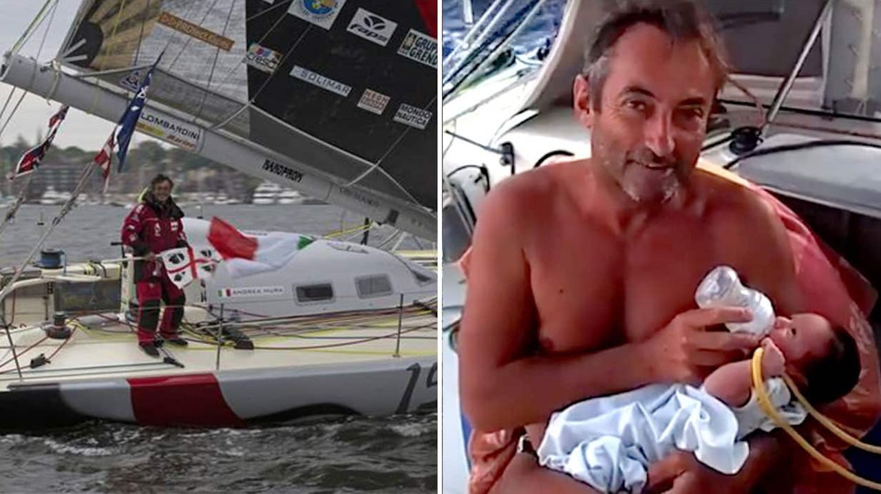 Ensamseglaren André Mura tog med sin tio dagar gamla son på transportseglingen till starten av Route du Rhum och tvingades tackla hård...