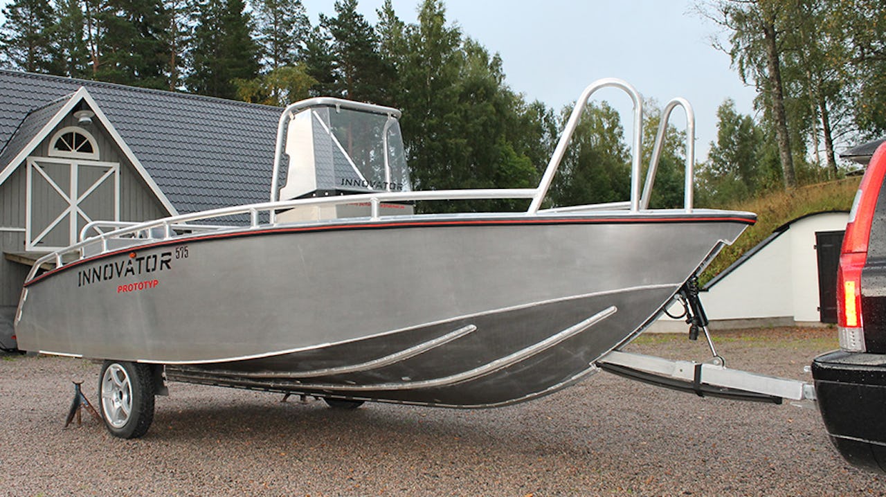 Till synes ännu en i mängden av aluminiumbåtar. Men inne i skrovet döljer sig två hjul som fälls ut hydrauliskt på bästa...