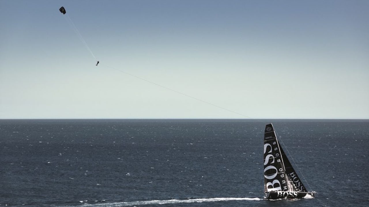Det är oklart hur högt upp i luften ensamseglaren Alex Thomson lyckas komma innan han släpper draglinan från sin 60-fots segelbåt. Men...